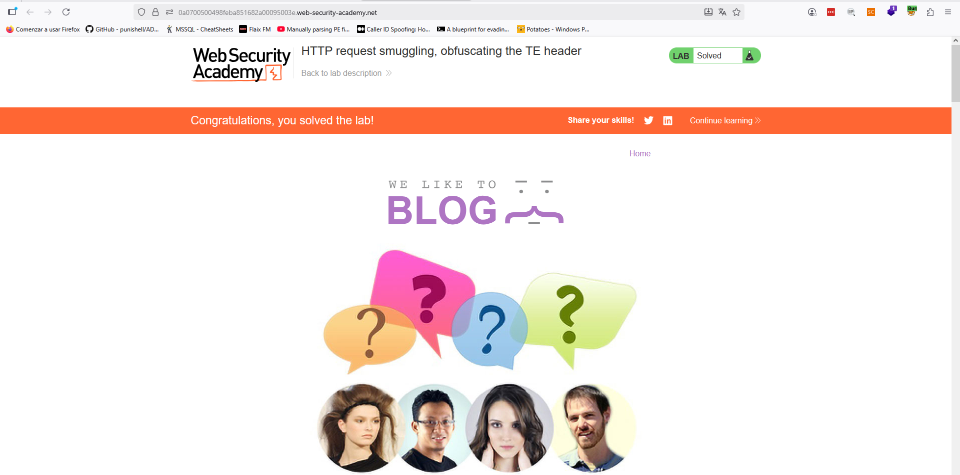 Tal como vemos, aunque para el frontal son dos peticiones totalmente bien formadas, para el servidor de backend, la primera petición acaba justo después del «0». Por ello, lo que ve tras esa petición es la petición «GPOST» (recuerda que entre la G y el POST no hay espacios, simplemente es por cómo lo mostramos aquí). Así las cosas, hemos hecho HTTP Request Smuggling y resuelto el laboratorio, al haber utilizado los delimitadores para enviar peticiones divididas.