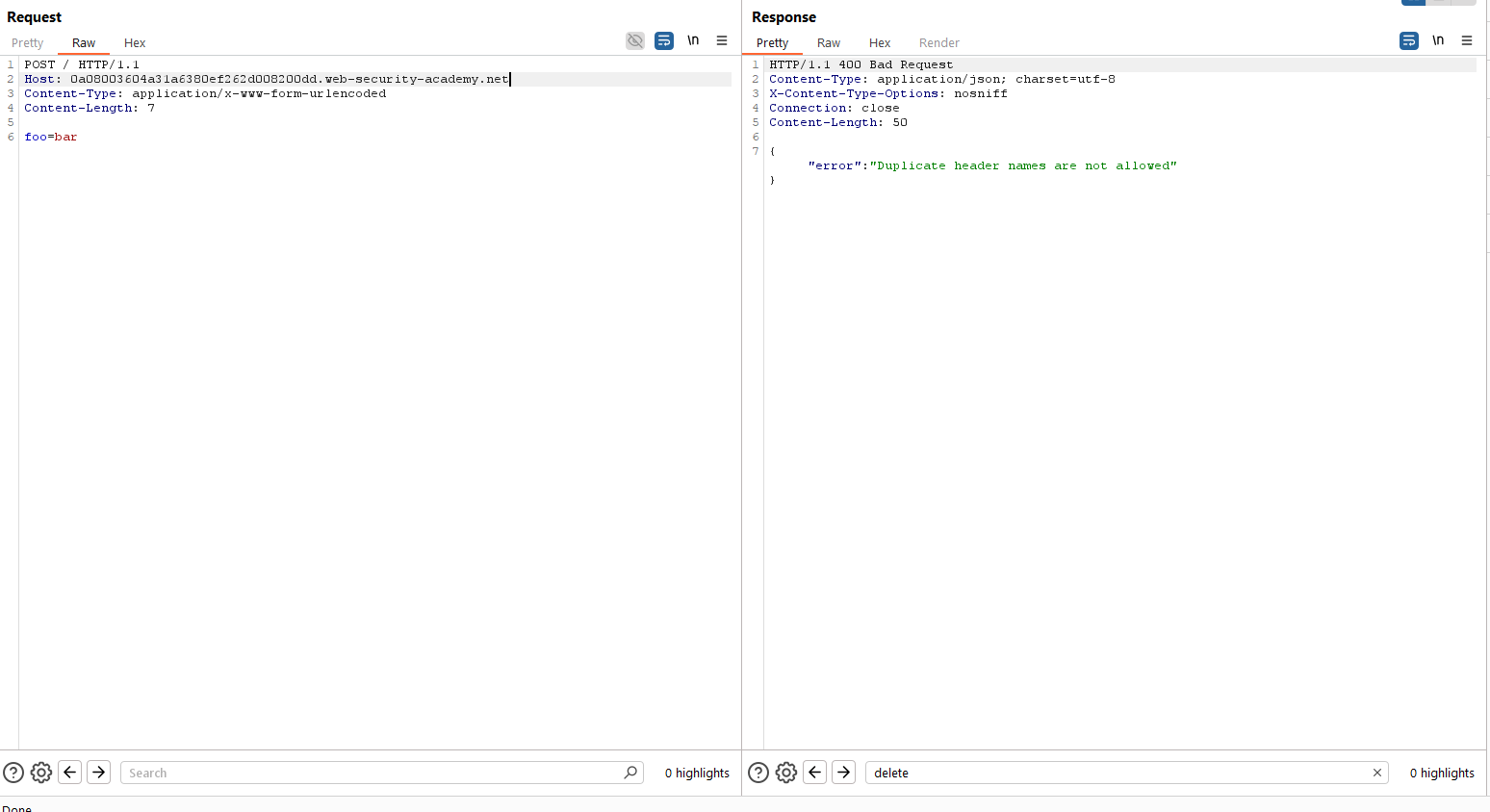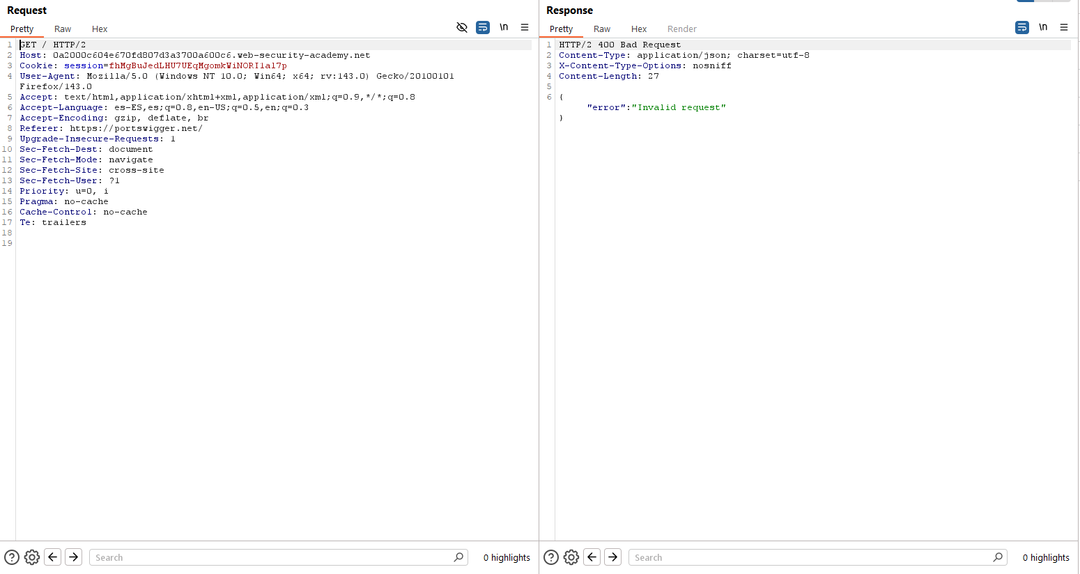 De nuevo error, ya que la cabecera «Host» de la petición smuggled y la petición legítima tienen conflicto. Para resolverlo, haremos que la petición legítima forme parte del body de la smuggled para que así la cabecera solo sean datos:
