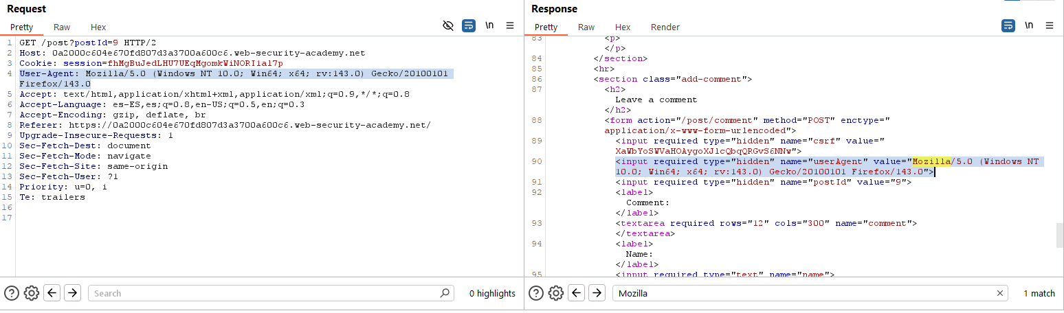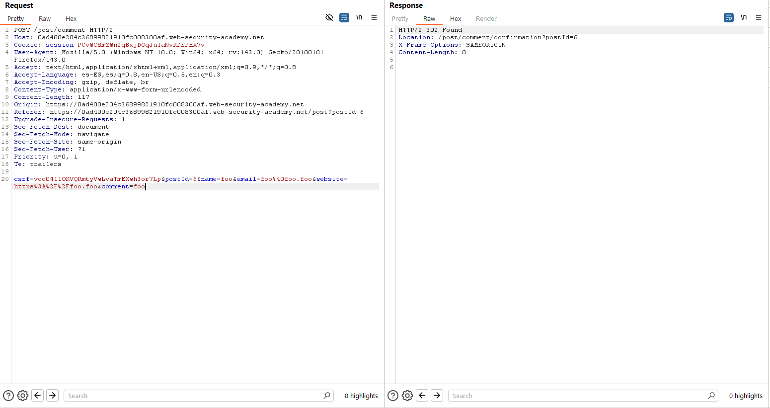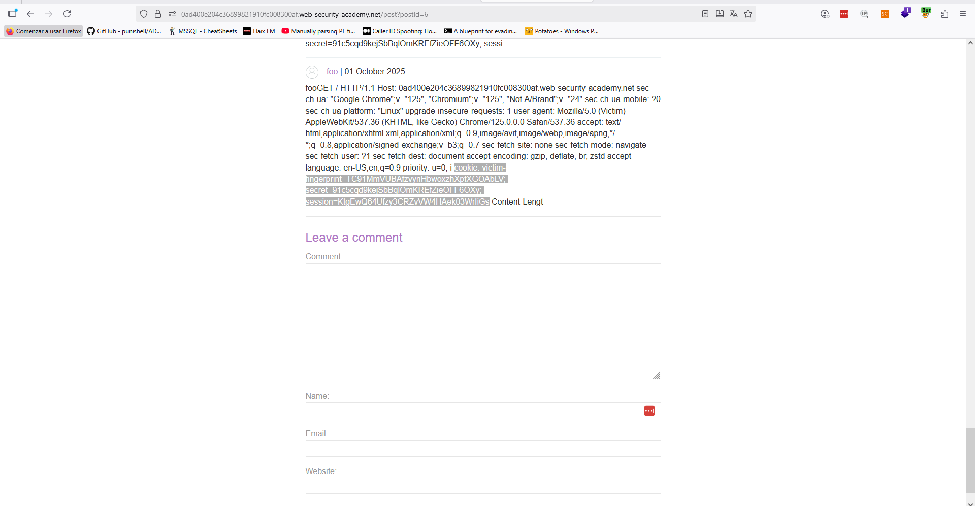 Dado que queremos exfiltrar información de una petición válida de un usuario, debemos encontrar una petición en la cual el mensaje se refleje en algún punto de la aplicación. Los comentarios en el blog siempre son buenos candidatos, por lo que observamos la petición al incluir uno de ellos y reordenamos los parámetros para poner el último el mensaje enviado: