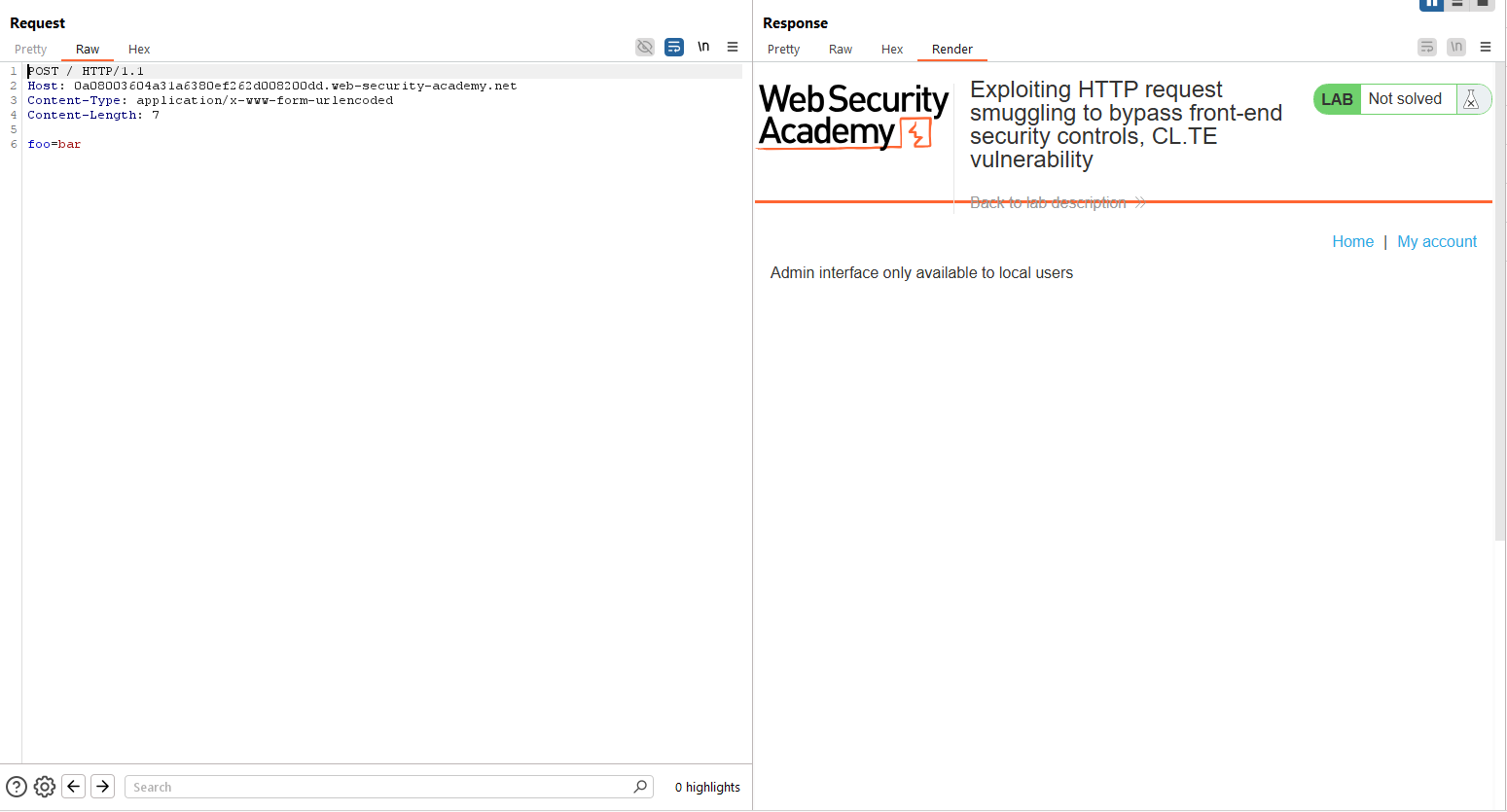 Podemos proceder con el análisis a través de la CheatSheet y veríamos que estamos ante un caso de CL.TE. Para acceder al panel de administración, intentamos en primer lugar el siguiente payload: