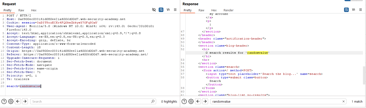 Comenzamos mapeando la aplicación y vemos que el parámetro de búsqueda se ve reflejado en la respuesta del servidor: