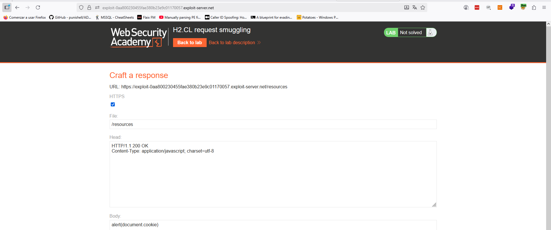 Por tanto, si logramos «inyectar» dicha petición para que la víctima la ejecute, lograremos que ejecute el código que almacenemos en el recurso «/resources» de nuestro «Exploit Server». Almacenamos en él el siguiente payload:
