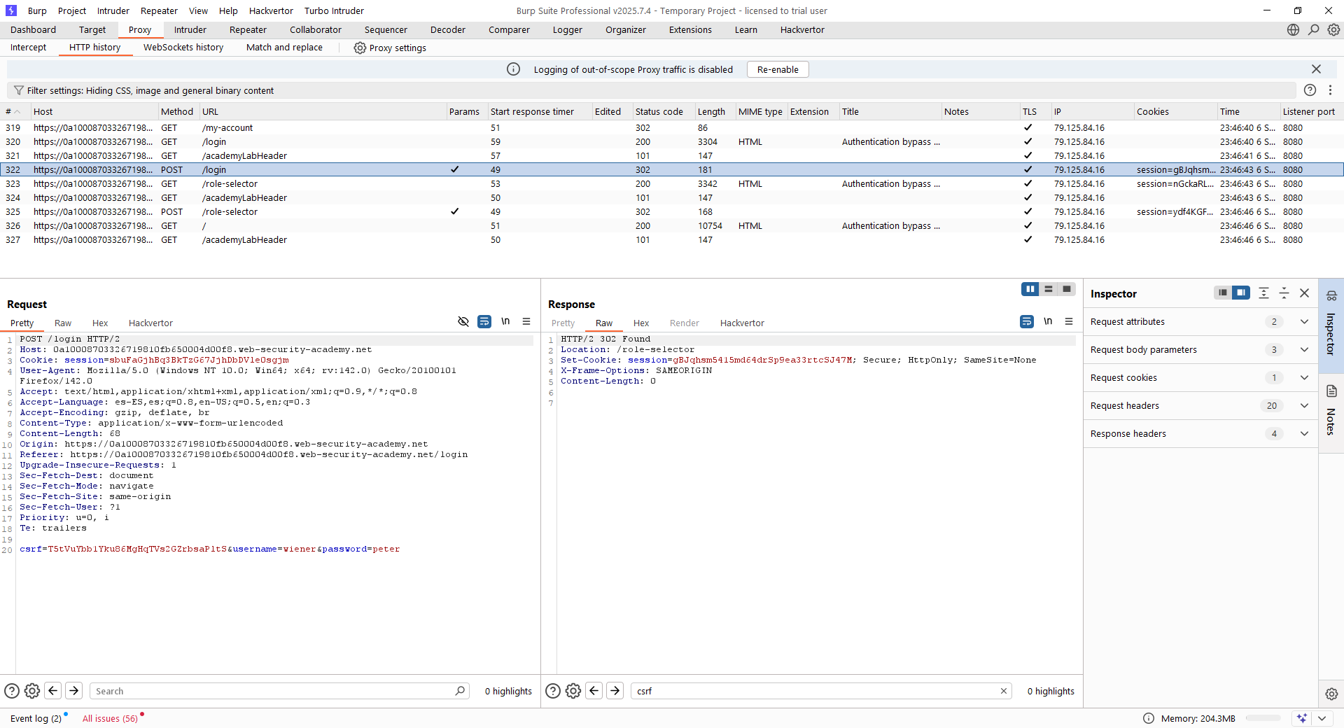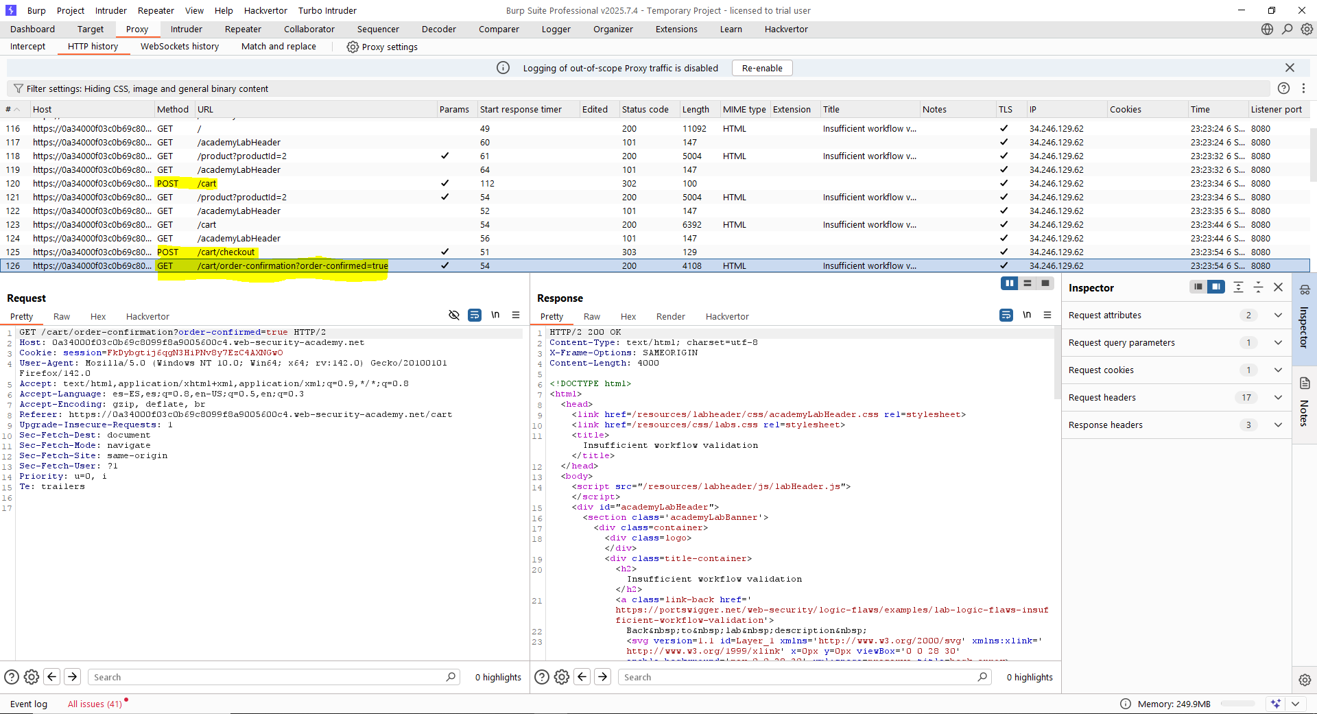 En este caso, la vulnerabilidad reside en que el flujo lógico no comprueba que el usuario que lanza la segunda fase de la autenticación multifactor sea el mismo que la inició. Por tanto, podemos iniciar un flujo de autenticación como «wiener» y seguir todo el flujo para loggear las peticiones. Tras ello, haremos un logout de la aplicación y retransmitiremos el flujo.