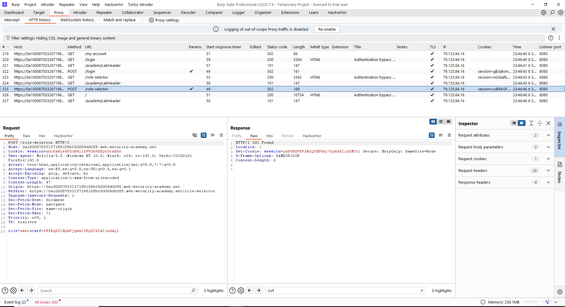 Todo parece correcto, pero como siempre, debemos evaluar qué ocurre si no se sigue el flujo. Para resolver este laboratorio, basta con que la aplicación no sepa qué rol debe asignar al usuario, ya que por defecto asignará el rol de administrador. Por ello, basta simplemente con hacer login con el usuario «wiener», eliminar la petición 2 (GET a «/role-selector») y navegar directamente a la raíz de la web.