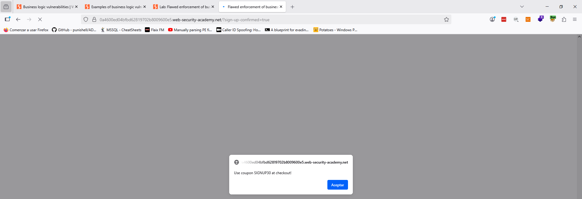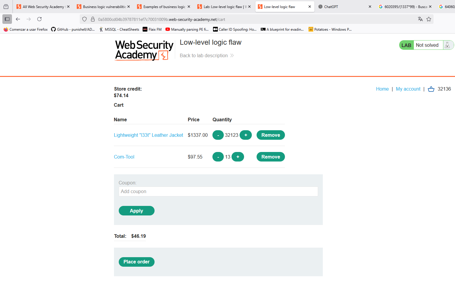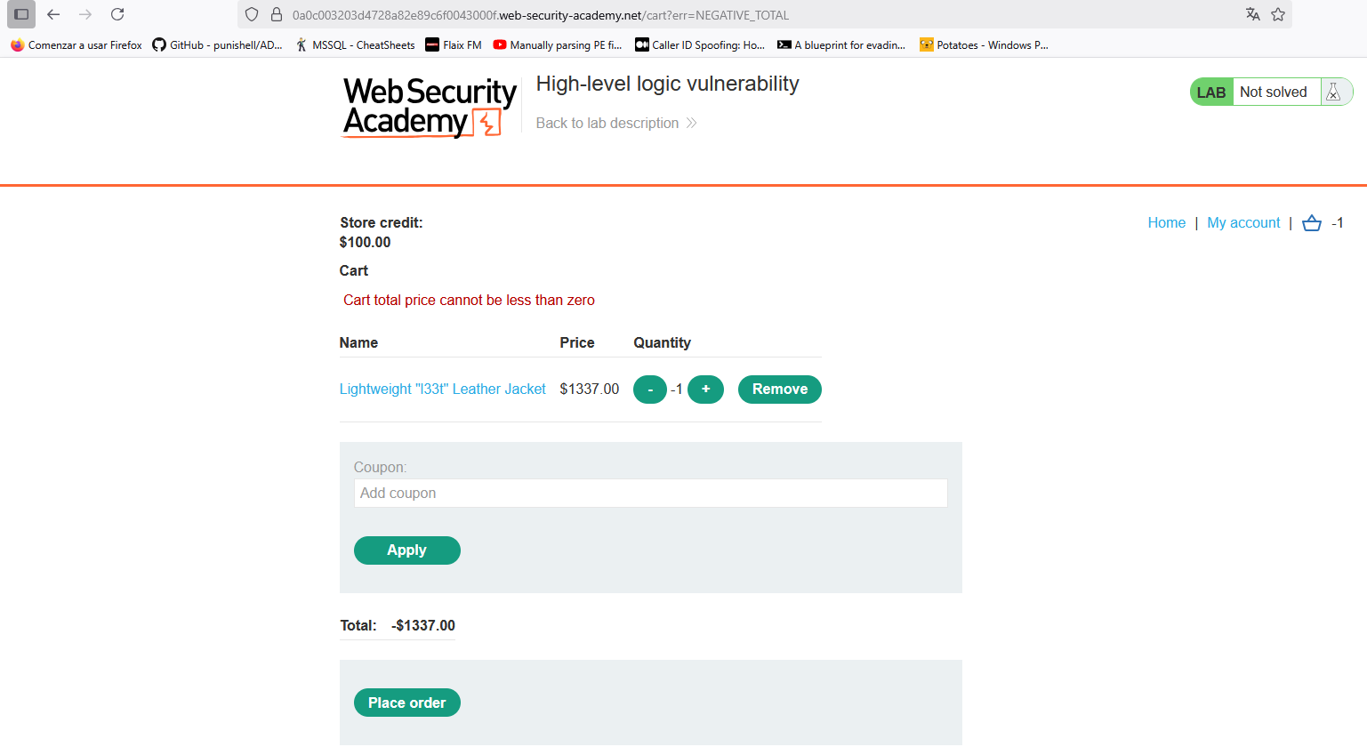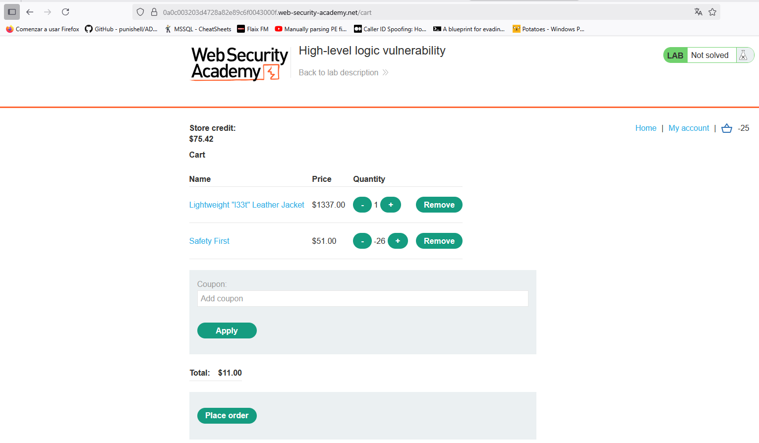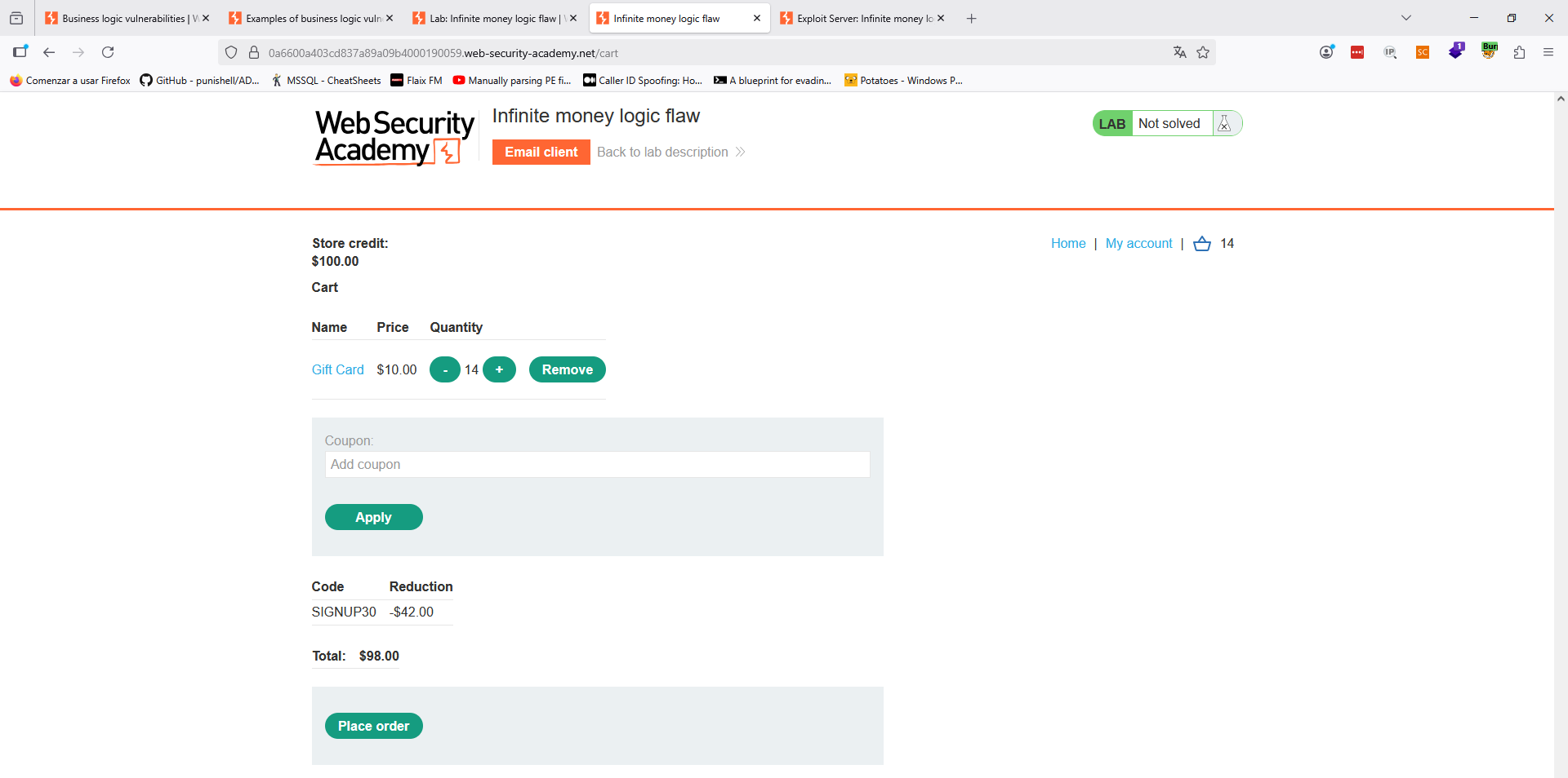 Si intentamos aplicar un cupón varias veces, la lógica de la aplicación falla de manera segura, indicando que el código ya está aplicado. Sin embargo, si usamos los códigos obtenidos de manera alternativa, podemos usarlos varias veces sin restricción. Para resolver el laboratorio, por tanto, añadimos los cupones de forma alternativa hasta que el precio encaje en nuestro balance: