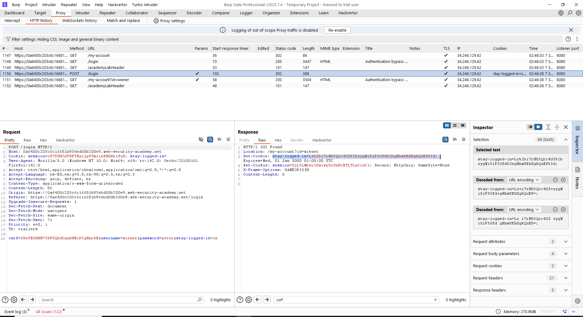 ¡¡Lo tenemos!! Ahora simplemente debemos hacer un «Pass-The-Cookie» para lograr resolver el laboratorio. Esto es, interceptar una petición al login no autenticada, meterle la cookie «stay-logged-in» y se debería iniciar la sesión sola, pudiendo borrar al usuario «carlos».