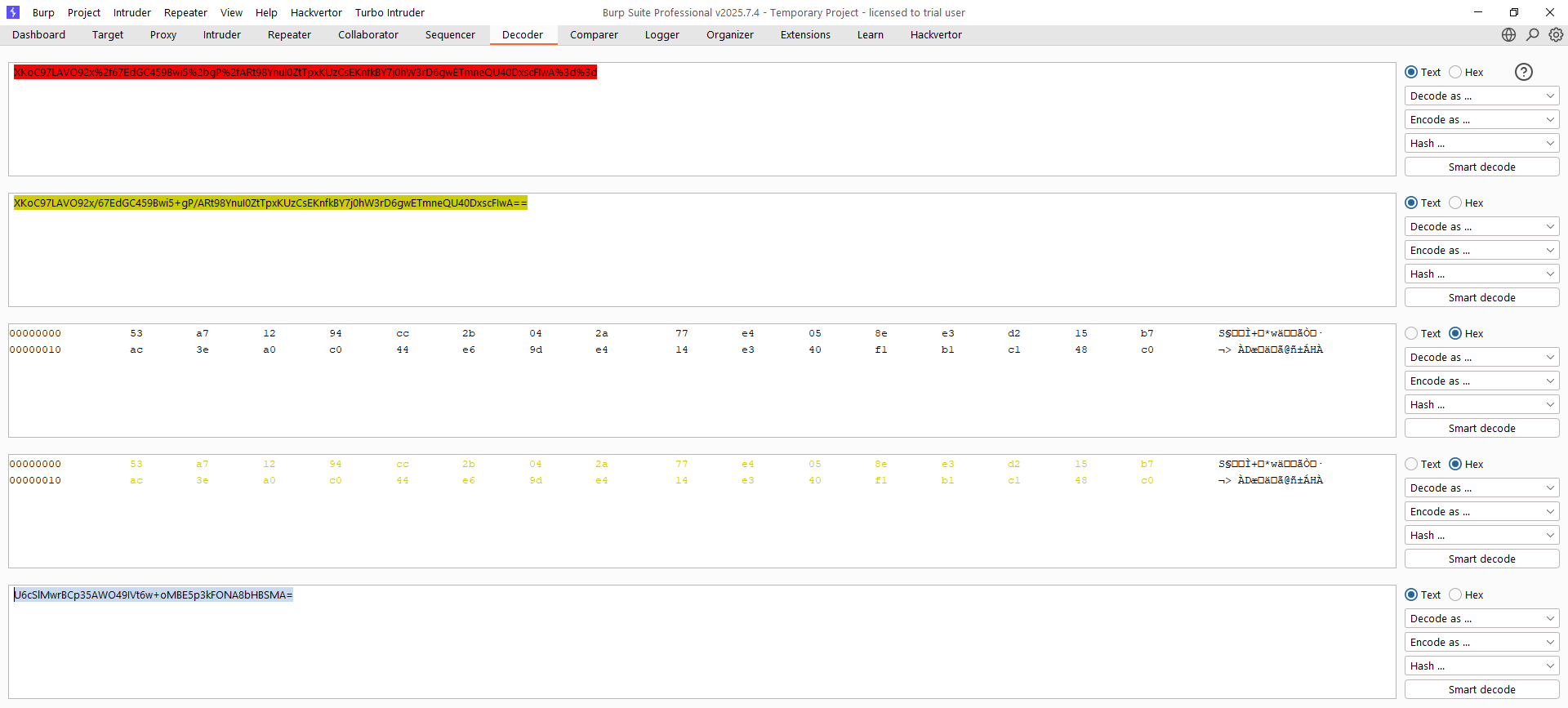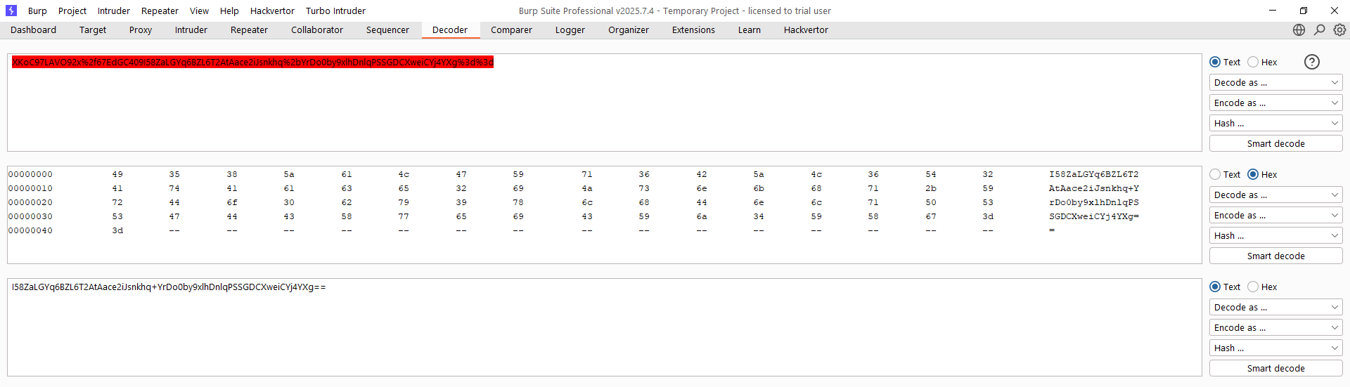 Lanzamos de nuevo el cifrado de la cadena, el descifrado y la eliminación de 32 bytes (en este caso son 32, no 23 lógicamente) en Burp Decoder. Mostramos solo este último paso, ya que el resto están más que demostrados anteriormente cómo hacerlos. Fíjate que aunque en el anterior caso no fue necesario decodificar en Base64, aquí sí debido a la presencia de caracteres como el slash: