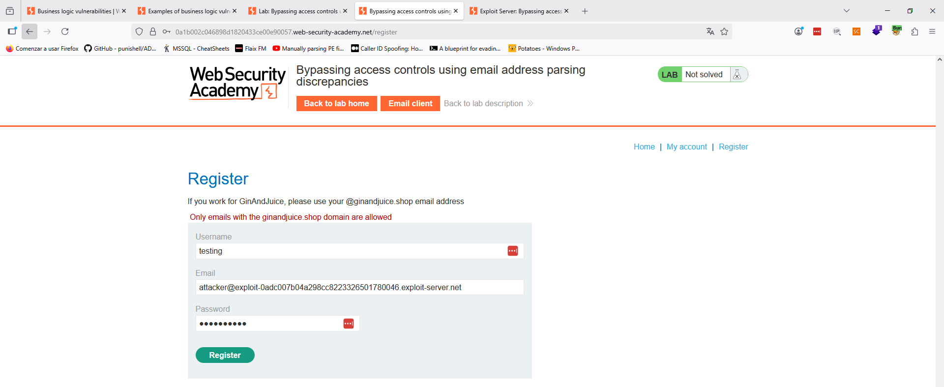 La primera prueba que haremos, será a registrar un correo del dominio proporcionado por el laboratorio en su «Email client». Lanzamos la prueba y vemos que nos da error, lo cual es esperable porque nos dicen que solamente los usuarios de «ginandjuice» deben poder iniciar sesión.