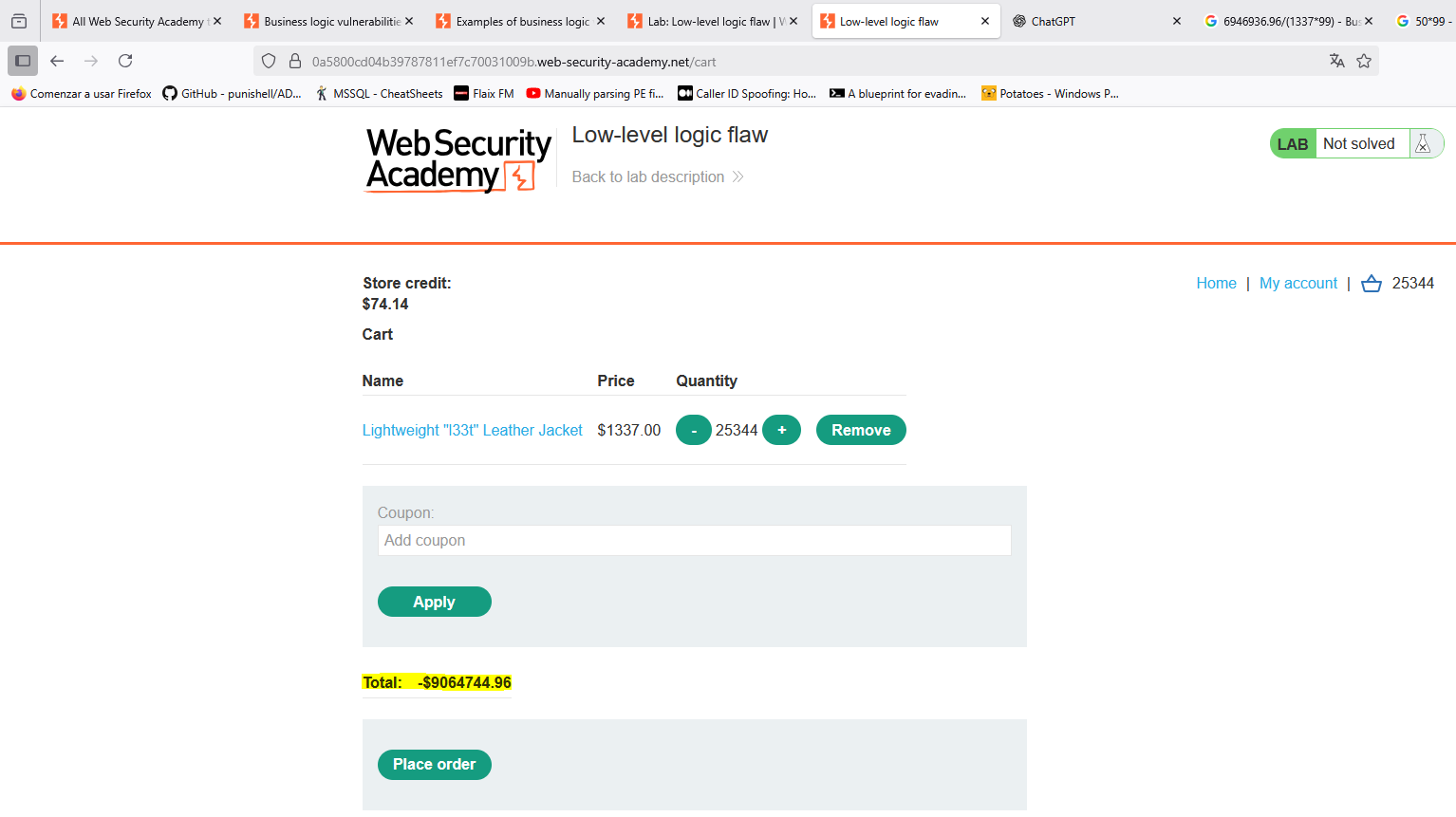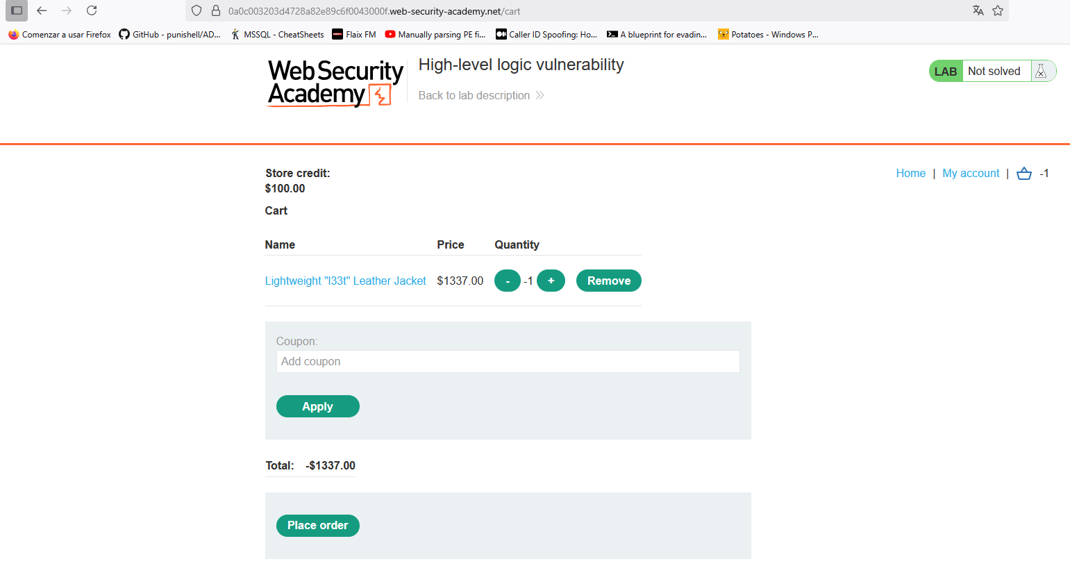 El código no es el más limpio ni rápido del mundo pero al menos, funciona para el propósito del laboratorio. En caso de que quieras refinarlo, la opción está ahí. Finalmente, para resolver el laboratorio una vez tengas el dinero suficiente, compra el artículo deseado.