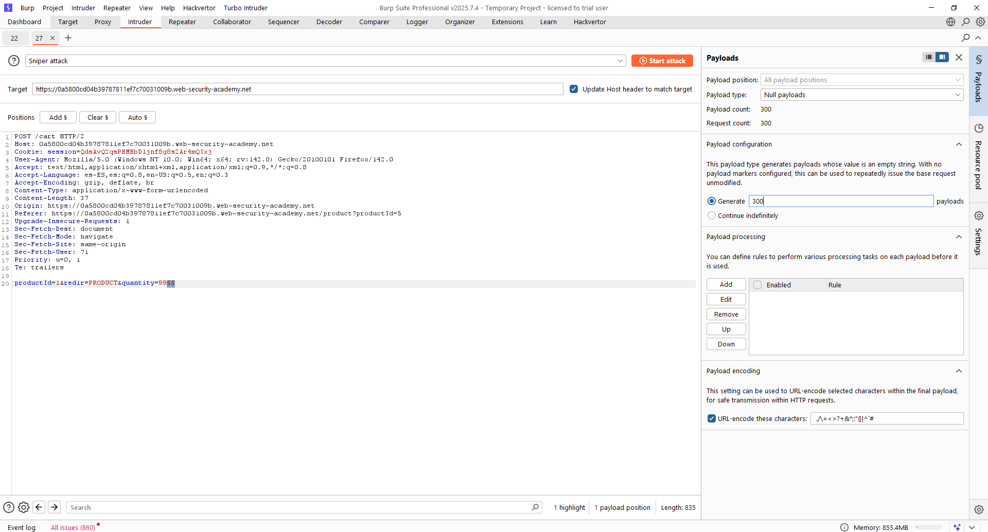 En este caso, el flujo es idéntico a los anteriores, pero ninguna de las técnicas ya mostradas funciona. Sin embargo, podemos seguir intentando hacer cosas no esperables. ¿Qué ocurre, por ejemplo, si se añaden miles de productos a la cesta? Vamos a evaluarlo incluyendo 99 «jackets» 300 veces. Usamos para ello el Intruder.