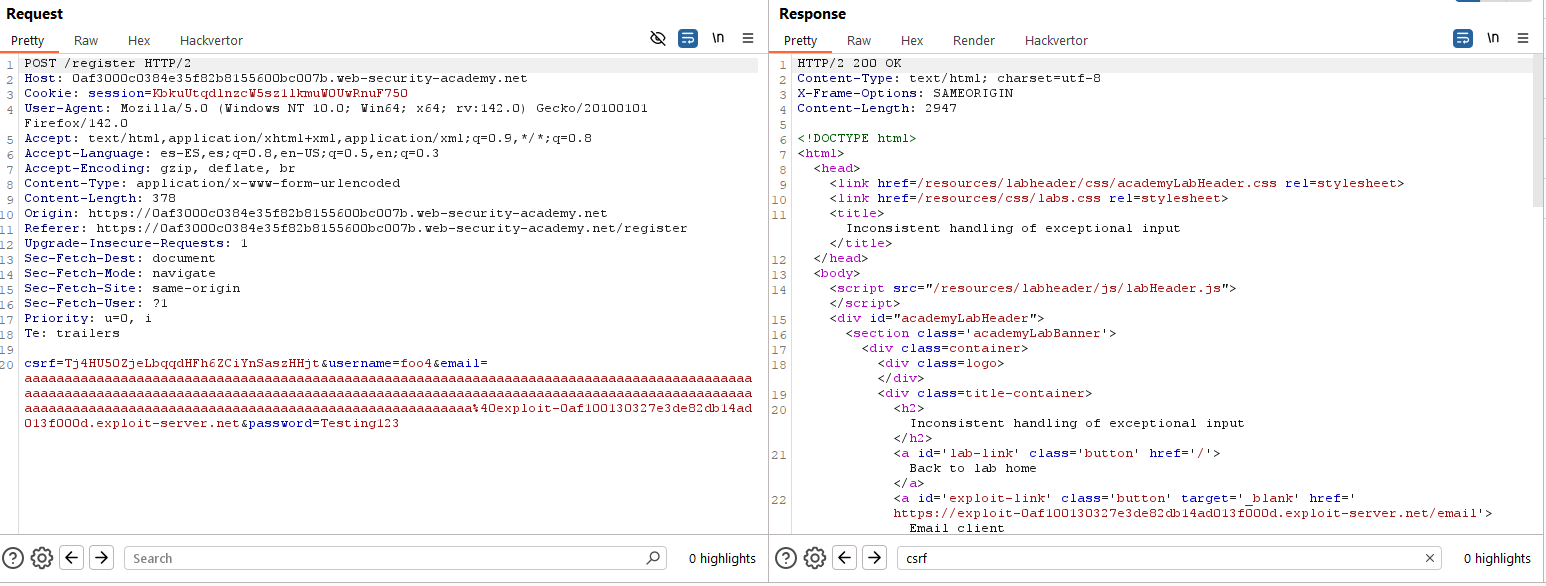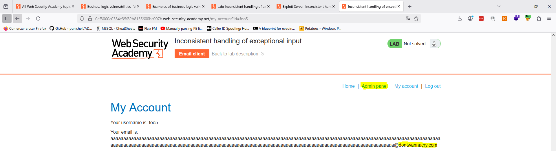 Como vemos, lo hemos clavado. El correo se truncó y a la aplicación web «le parece» que nuestro correo es del dominio indicado. Ahora, simplemente, accede al panel de administración y borra el usuario «carlos» para completar el laboratorio.