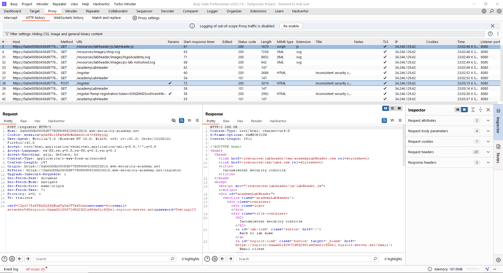 En primer lugar, dado que necesitamos acceder a un panel de administración, asumimos que debemos registrarnos en la plataforma. Nos registramos usando un correo controlado por nosotros, revisando todas las peticiones en el Burp. En este caso, usaremos el cliente de correo que nos proporciona PortSwigger.