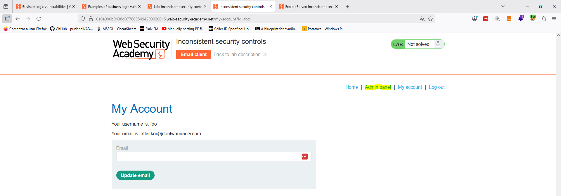 Como vemos, el registro de usuarios es normal, sin que existan a priori puntos donde la lógica de la aplicación pueda fallar, más allá del correo y comprobar longitudes como hemos hecho en anteriores laboratorios. Sin embargo, eso no funciona en este caso. Sí que debemos darnos cuenta que la propia web nos indica que si pertenecemos a «dontwannacry.com» usemos un correo corporativo. Accediendo a la web con el nuevo usuario creado, podemos ver que es posible actualizar el email registrado. En este caso, como pretendemos hacernos pasar por un empleado de «dontwannacry.com», cambiaremos el correo a «attacker@dontwannacry.com».