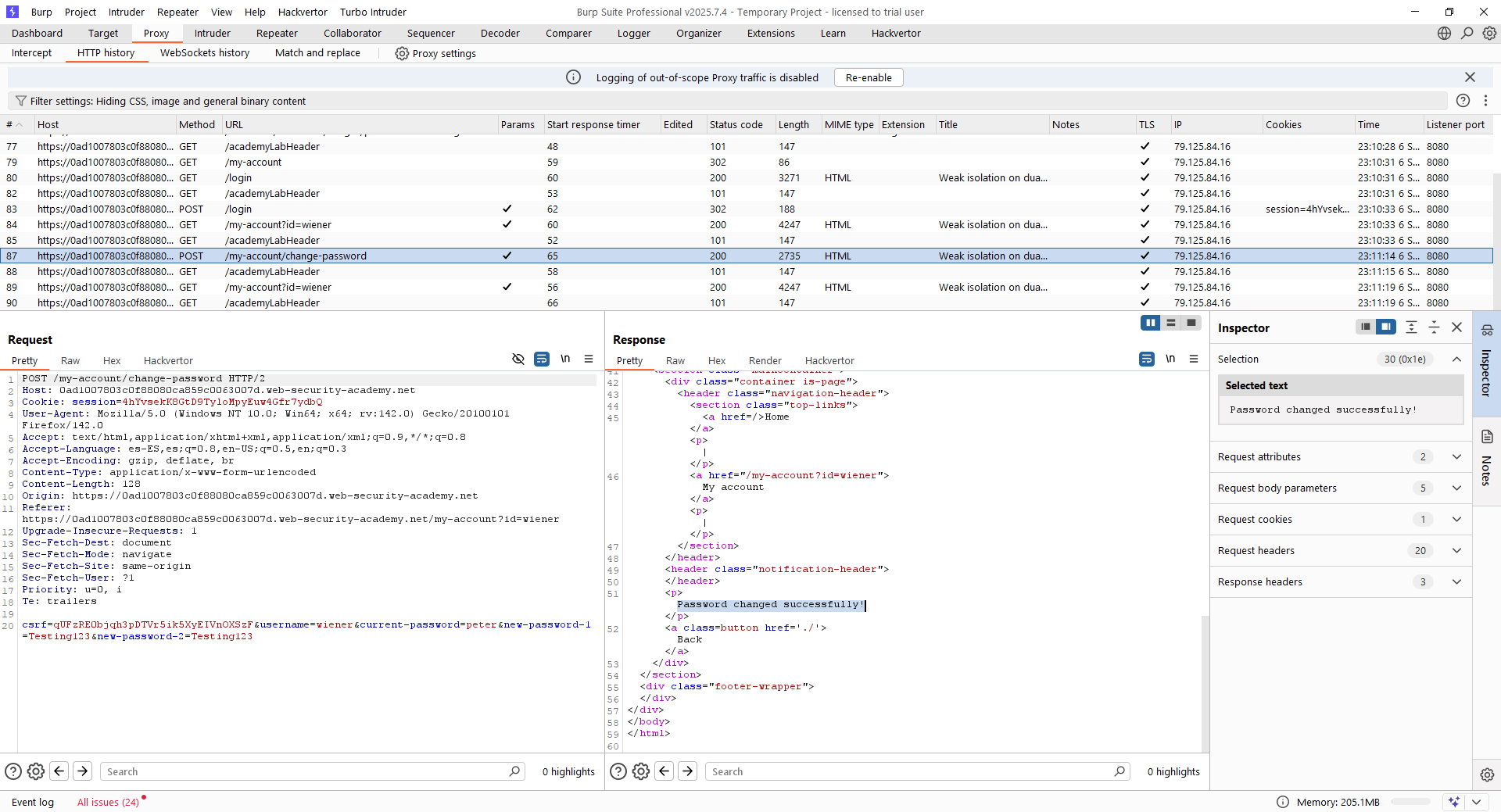 Para evaluar este laboratorio, iniciamos sesión en primer lugar con las credenciales proporcionadas «wiener:peter». Yendo a «My account», se puede ver que existen dos formularios: uno para cambiar el correo y otro para cambiar la contraseña del usuario. Este segundo formulario será el que explotemos, ya que a priori la petición pide usuario, contraseña vieja y contraseña nueva, además de la confirmación, aunque como veremos no todos los parámetros son necesarios: