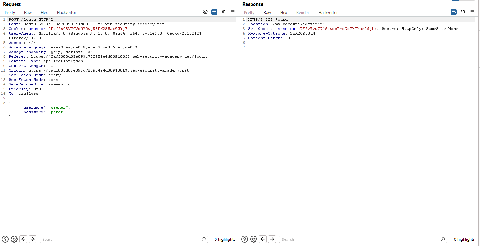 Comenzamos evaluando la aplicación y vemos que únicamente tiene como superficie de exposición válida para la elevación de privilegios el inicio de sesión. Usamos el usuario «wiener:peter» y evaluamos cuál es la petición que se realiza.