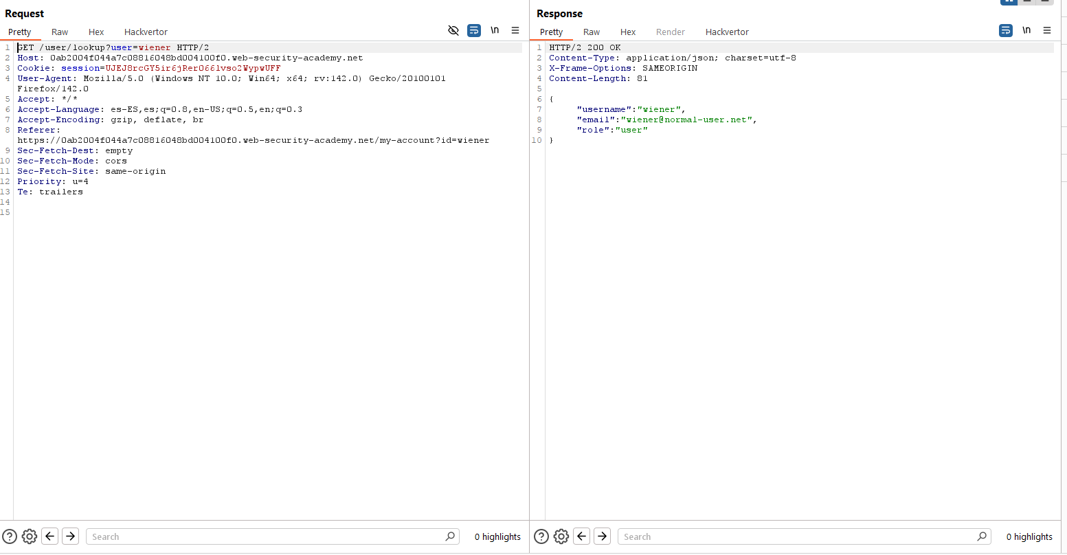 Accedemos en primer lugar con el usuario «wiener:peter» y observamos una API que nos permite listar otros usuarios. Capturamos dicha petición, pues será vulnerable: