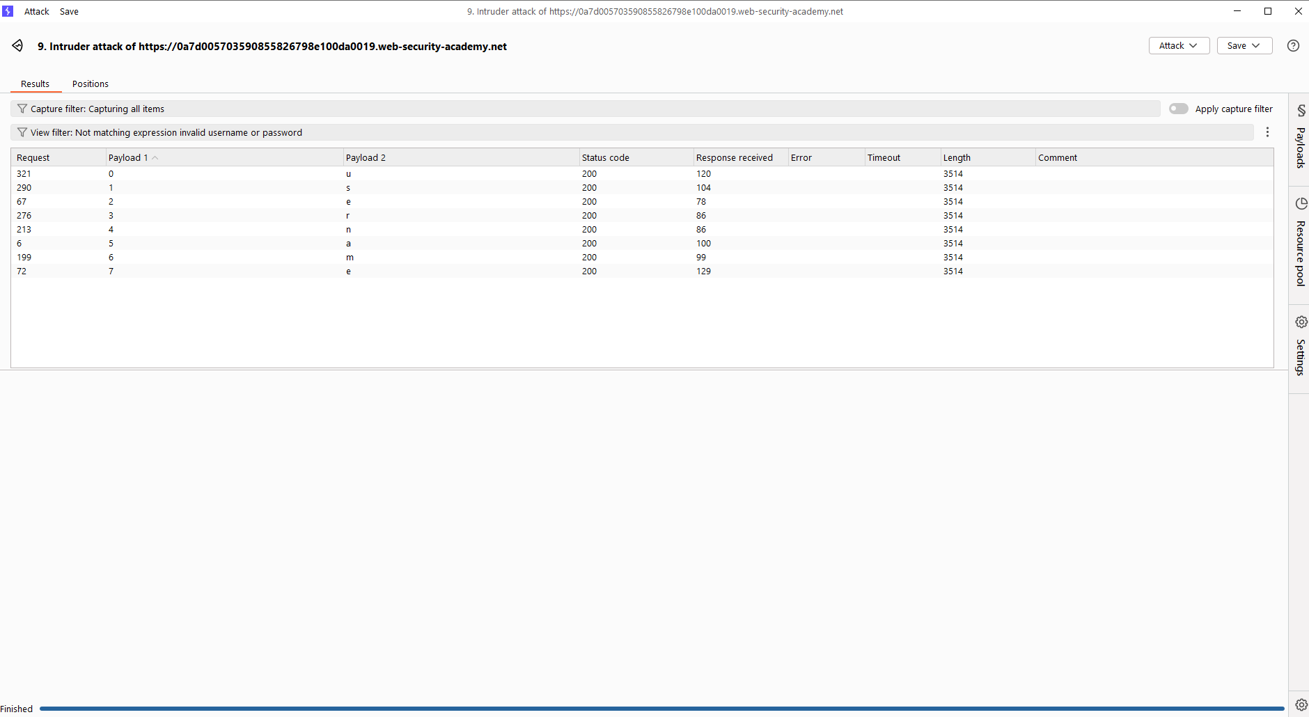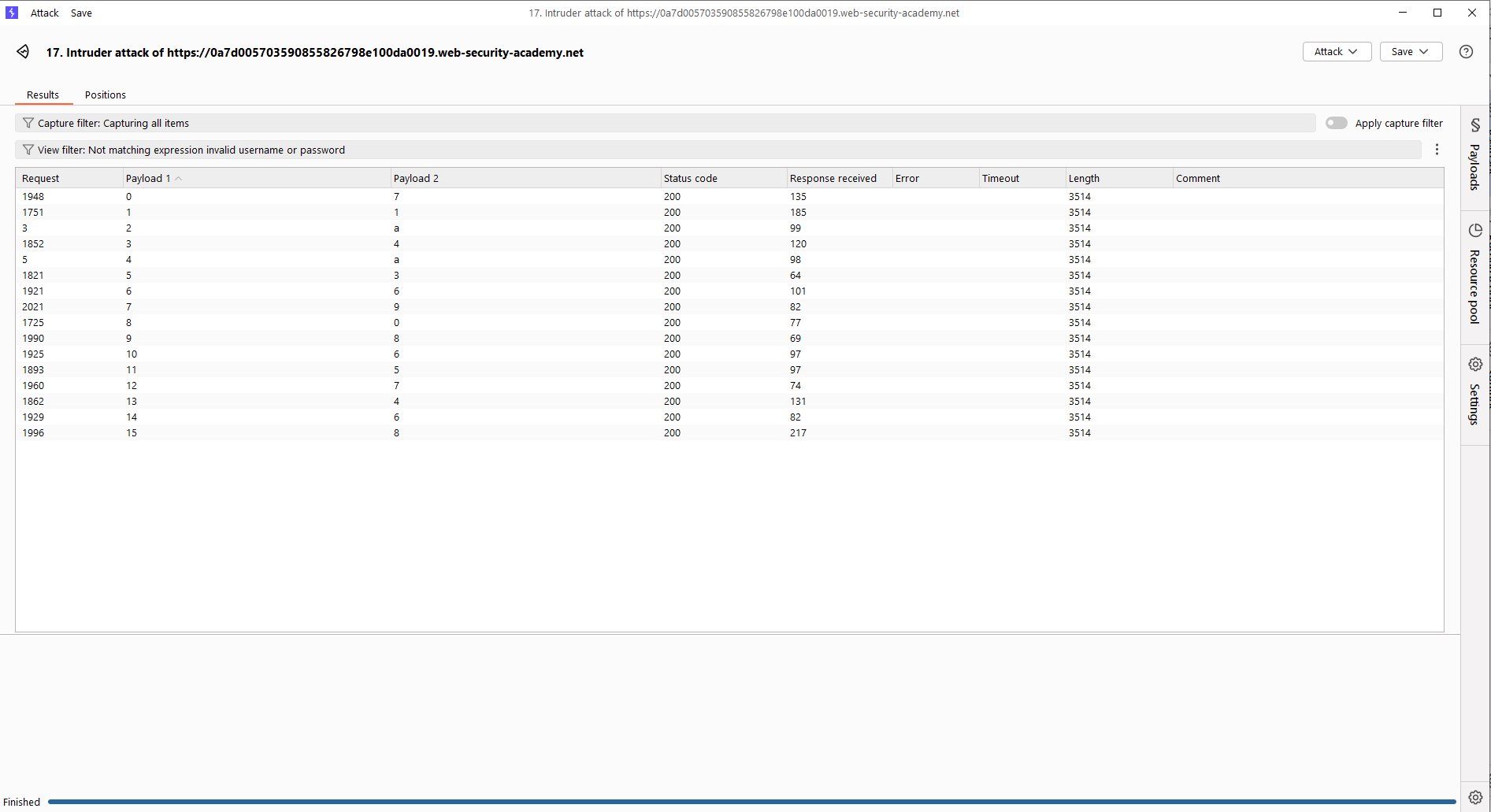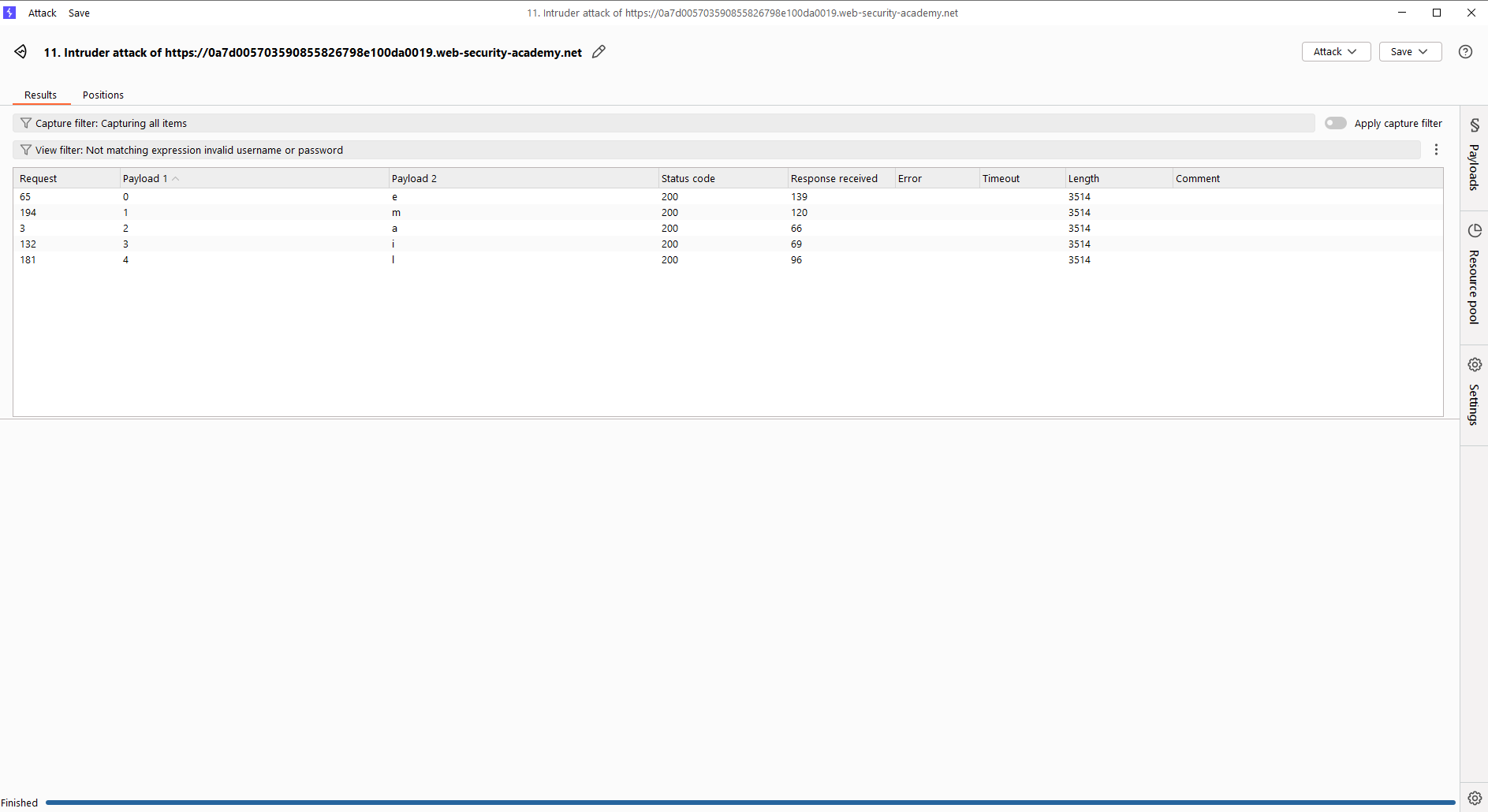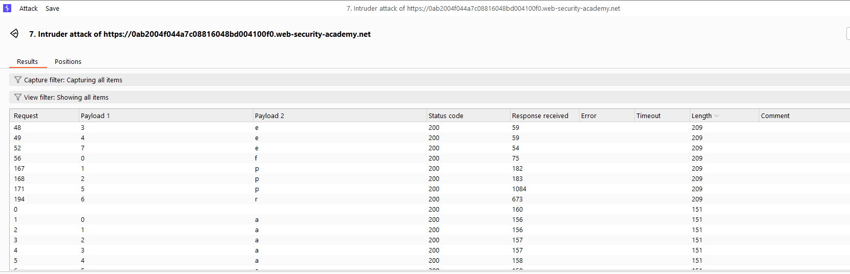Como vemos al lanzar Burp Intruder en modo Cluster Bomb con el primer payload numérico y el segundo alfanumérico, obtenemos la contraseña del usuario administrador. Esto es porque dichas respuestas son las únicas cuya longitud difiere del resto, ya que de normal la aplicación devolverá el error «Could not find user» para todas las peticiones salvo aquellas para las que la letra de la contraseña en la posición que probamos sea la correcta, donde devolverá los datos del administrador. Por tanto, simplemente ordenando las letras y tomándolas como contraseña podemos iniciar sesión y resolver el laboratorio.