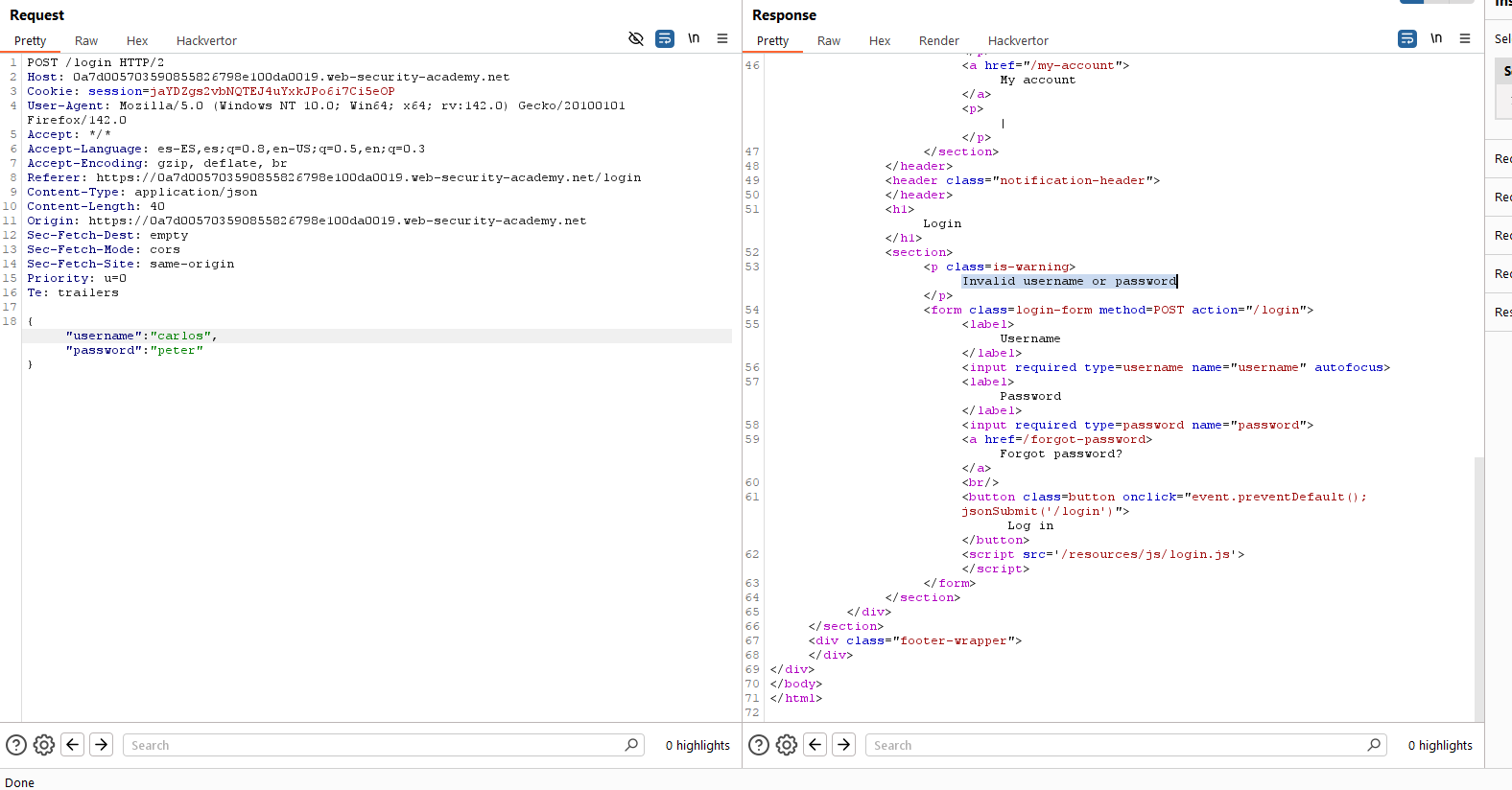 En este laboratorio, evaluaremos de nuevo el inicio de sesión. Fíjate cómo al incluir un payload de inyección de operadores básico en la contraseña para el usuario «carlos», recibimos una respuesta diferente que al utilizar una contraseña normal: