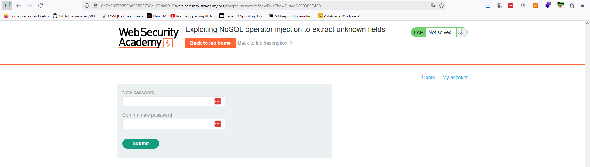Bien, ahora sabemos que el campo se llama «newPwdTkn». El siguiente paso del proceso es extraerlo para el usuario «carlos». Con el mismo enfoque, usaremos el siguiente payload: