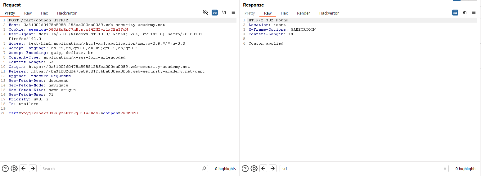 Comenzamos visualizando que la aplicación nos provee un código de promoción «PROMO20», por lo que lo aplicamos y capturamos la petición enviada para redimirlo teniendo ya el artículo en la cesta con el usuario «wiener:peter».