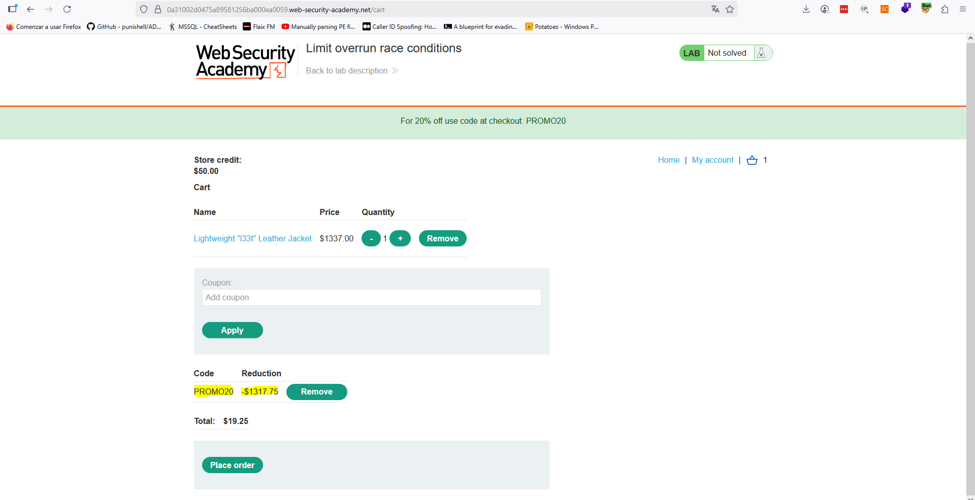 En segundo lugar, tomemos como referencia el objetivo que nos proponen: «To solve the lab, successfully purchase a Lightweight L33t Leather Jacket.». En este laboratorio debemos identificar y explotar una condición de carrera que nos permita comprar el artículo indicado.