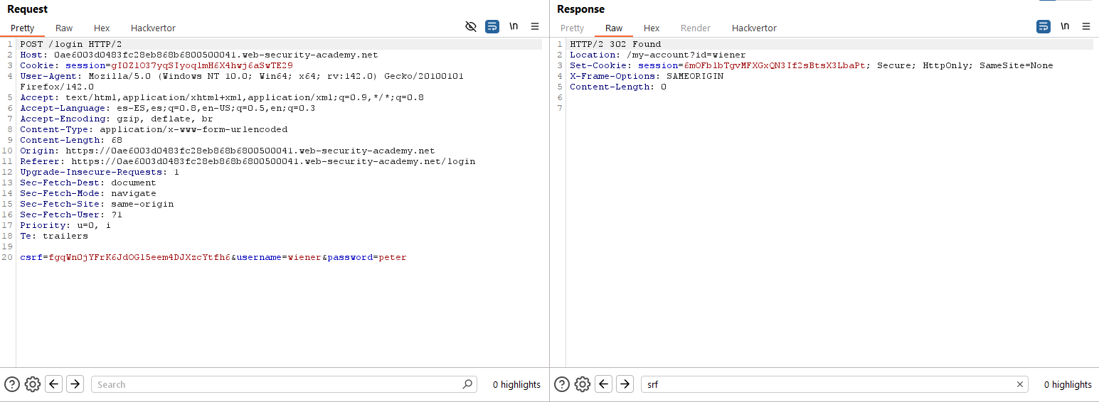 Comenzamos, en primer lugar, haciendo una petición de login con el usuario «wiener:peter» para conocer cómo se compone la petición de inicio de sesión.