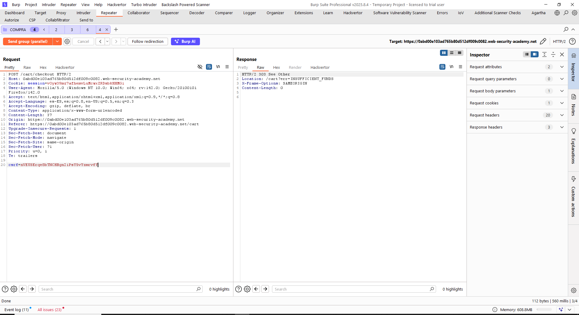 Como vemos, recibimos un mensaje de fondos insuficientes. Puede parecer contradictorio pero, para explotar la condición de carrera, debemos tener algo de «suerte» y que las ventanas temporales se ajusten. Por ello, necesitamos lanzar este mismo ataque varias veces, eliminando todas las veces el artículo que queremos comprar del carrito y dejando solo la gift card (acuérdate de cambiar el ID de producto en la petición POST para actualizar el carrito):