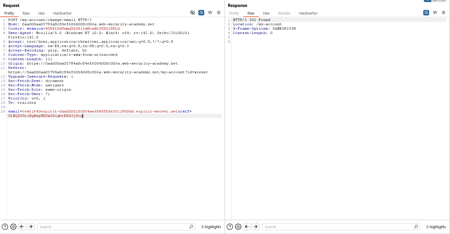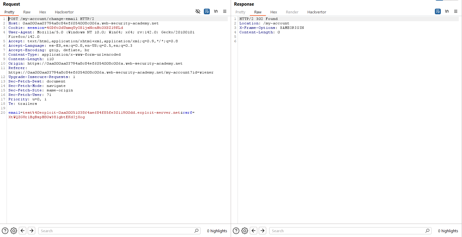 - Respuestas con código 400 indican token CSRF inválido (dado que ya se ha usado en la petición con respuesta 302)