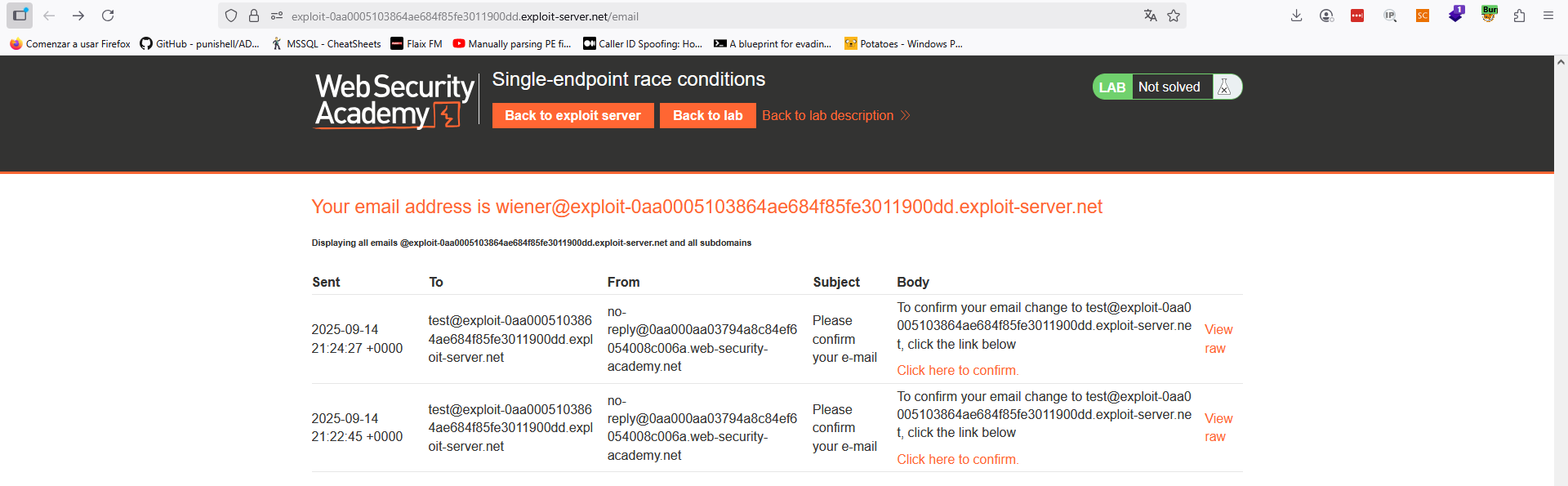 Como vemos, hay una desincronización de los correos producida porque la aplicación tiene dos estados probablemente: uno en el que el correo del usuario es cambiado y otro en el que finalmente se envía el correo. Al producirse la condición de carrera, se puede dar la situación de enviar un correo a la cuenta errónea tras haber sido cambiada. Aplicamos el mismo procedimiento pero con dos peticiones, una para cada uno de los siguientes correos: